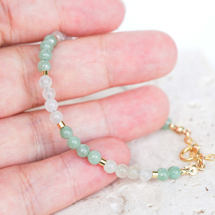 This Tiny Jade Bracelet with translucent green and white Jade beads offers a refreshing take on traditional jade jewelry, and is perfect for any occasion.