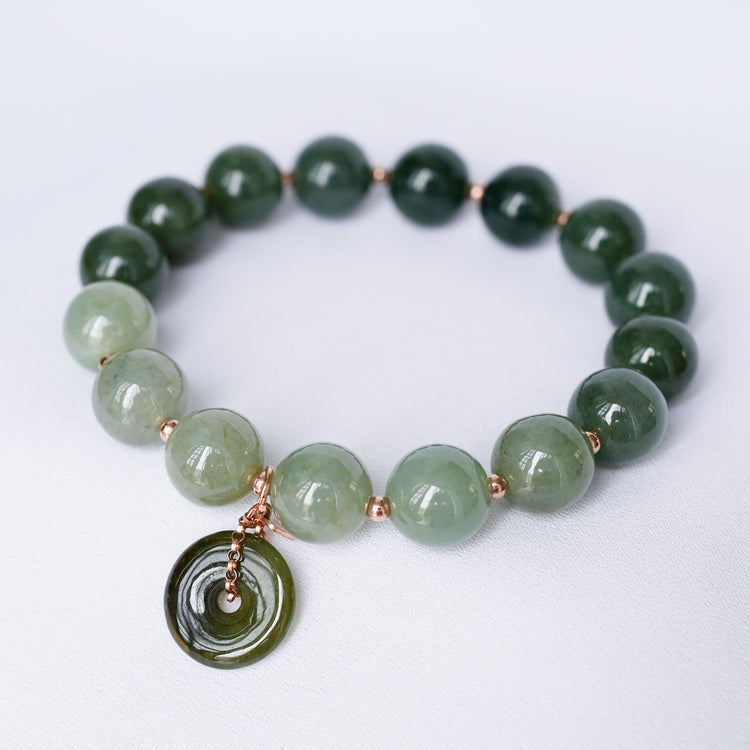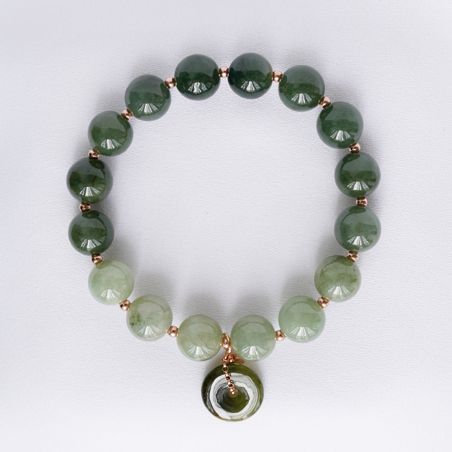 This Forest Green Jade Bracelet features jade beads arranged in a beautiful light-to-dark gradient, creating a natural flow of depth and richness. Alternating rose gold beads add warmth and refinement, while a jade donut dangle completes the design with a touch of modern elegance.