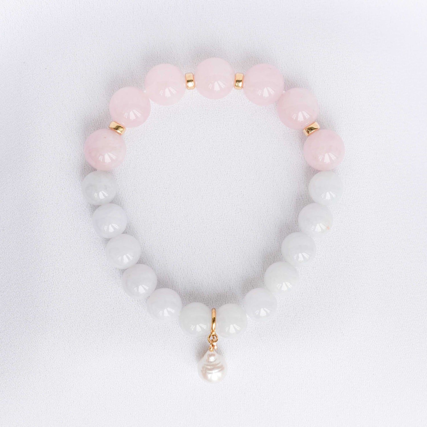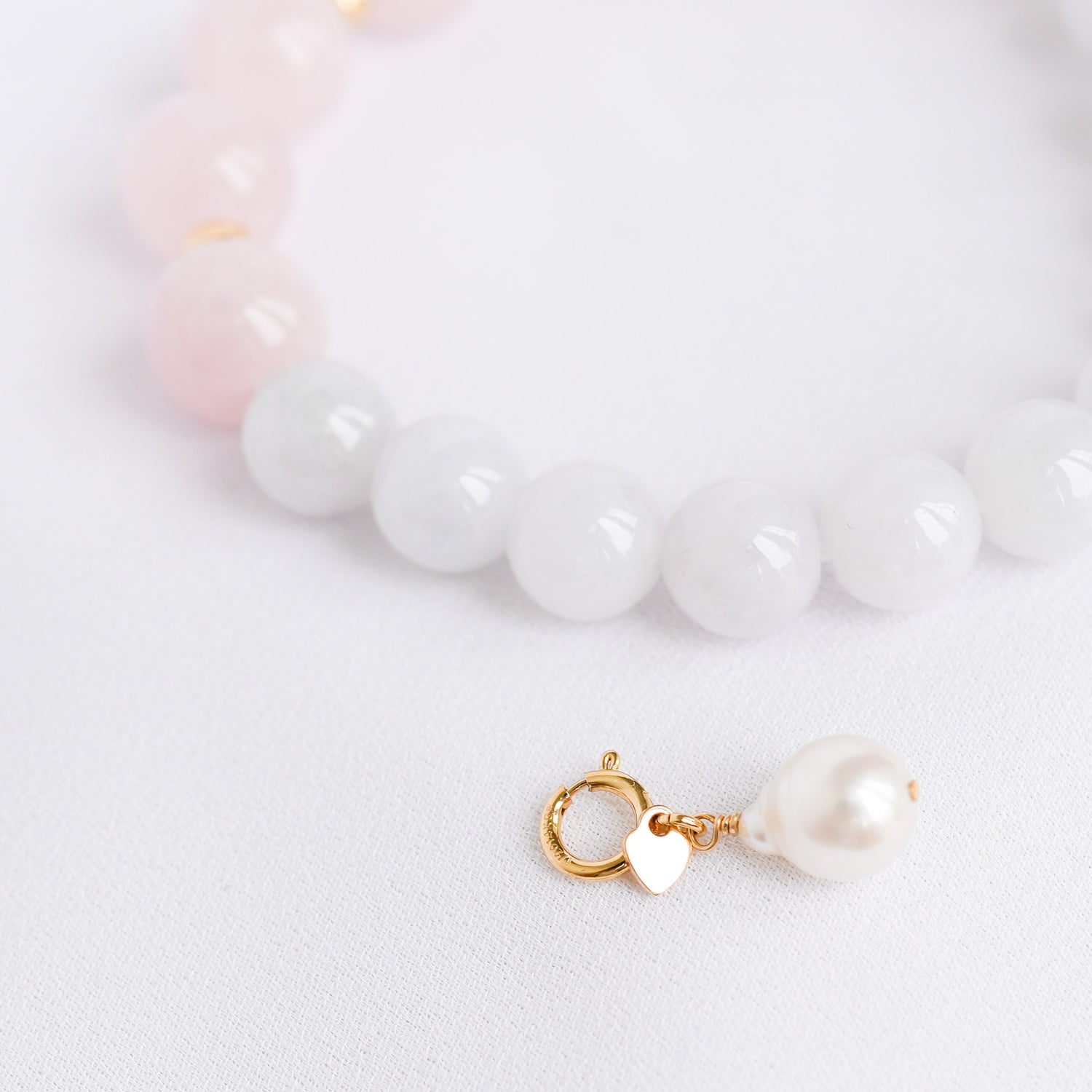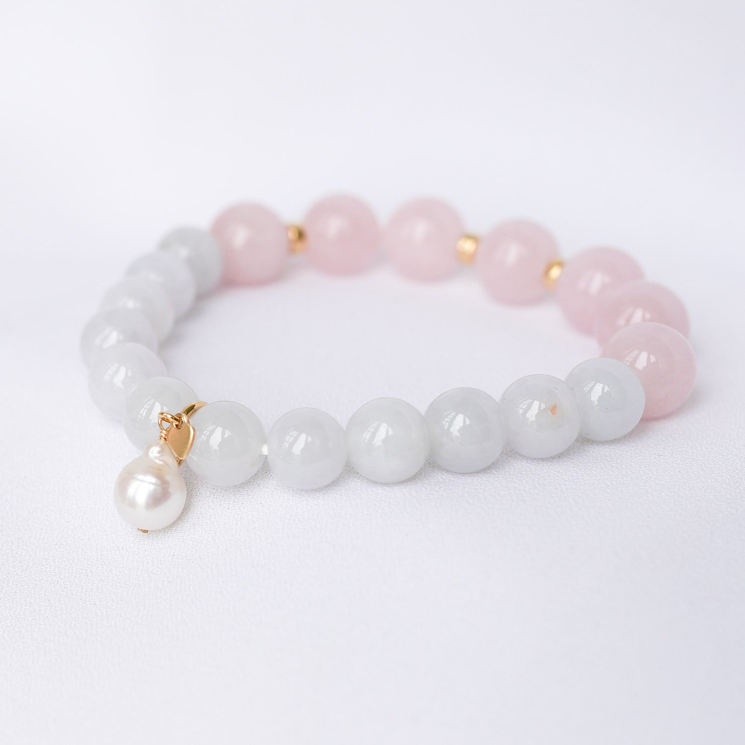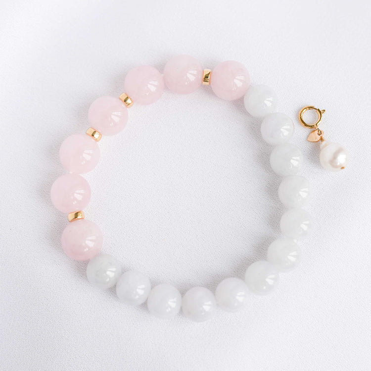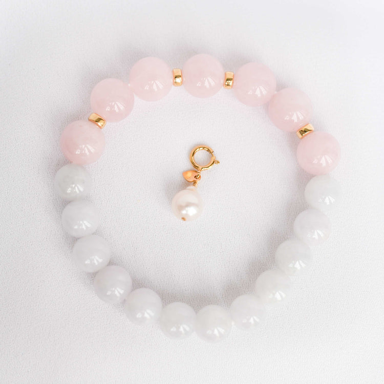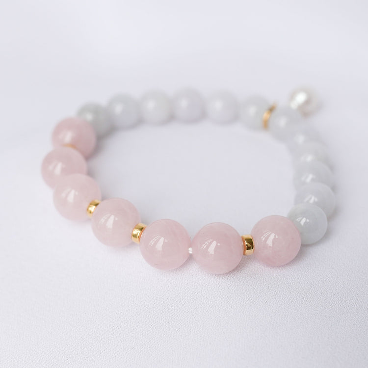 Soft lavender Jade and blush Rose Quartz beads are accented with subtle gold details and the cutest Pearl that's detachable. You can clip the Pearl anywhere on the bracelet and get endless looks out of it!