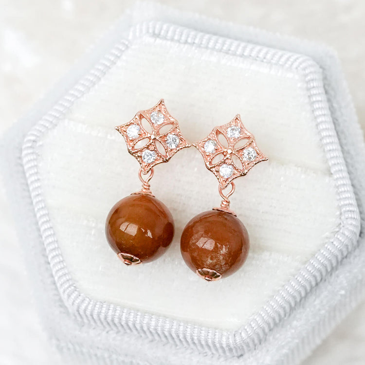 Dainty diamond-shaped ear studs with brown Jade, these earrings are elegant, easy to wear and match with any outfit.