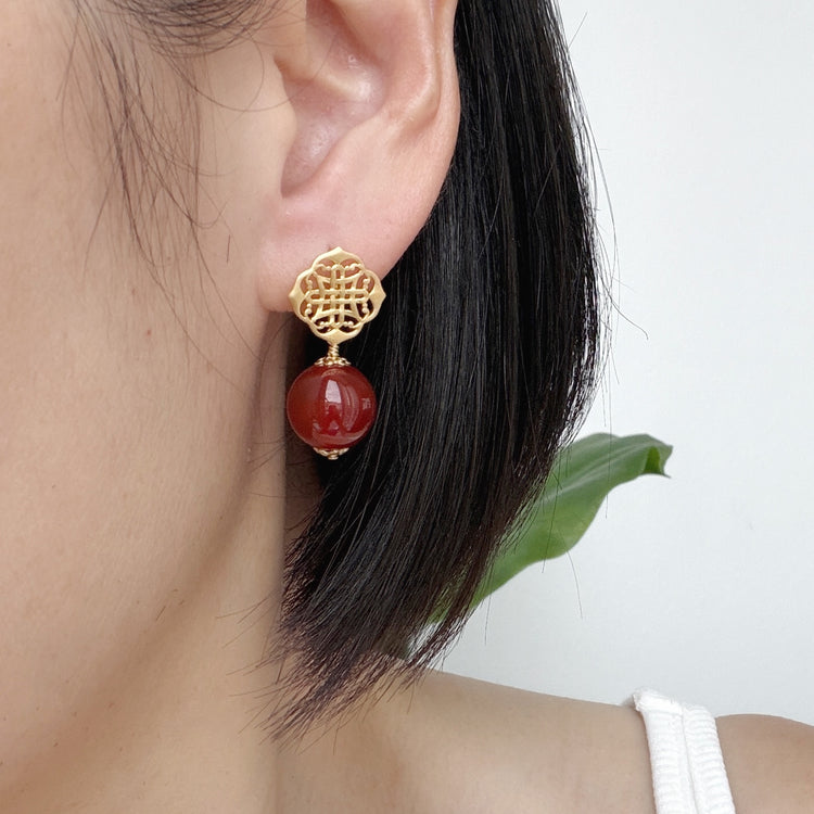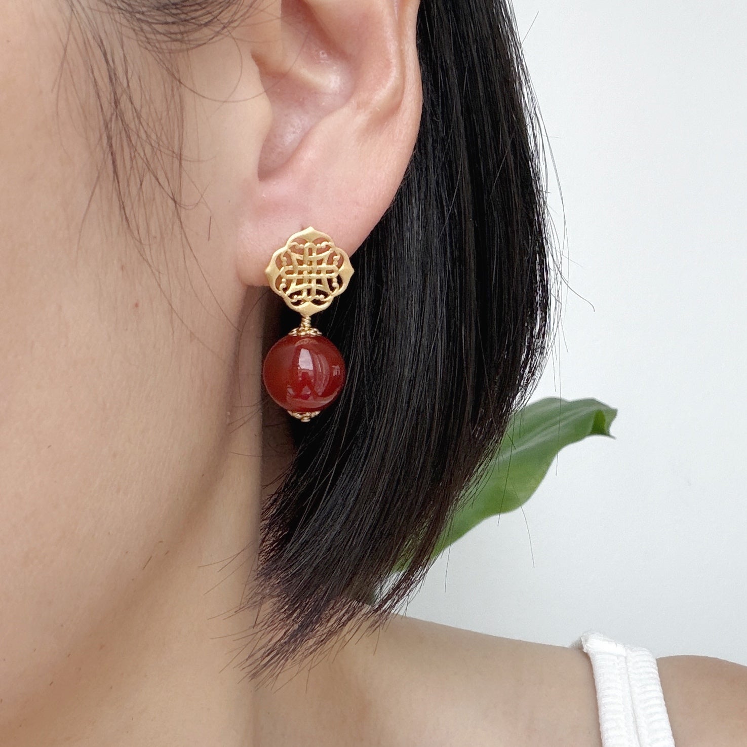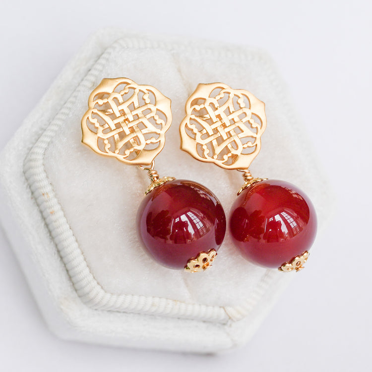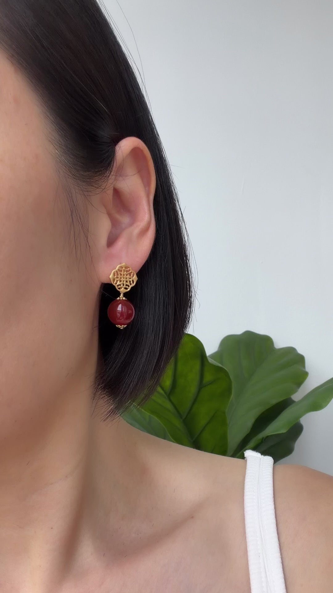 Peranakan-inspired stud earrings accented with red agate for a refined pop of colour. Easy to style and flattering on all skin tones.