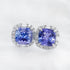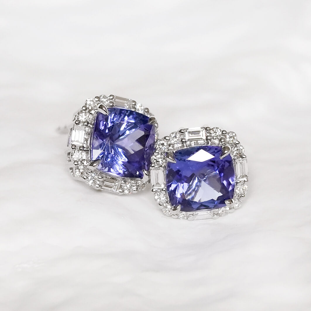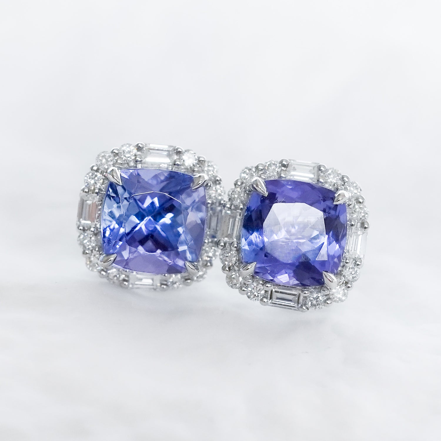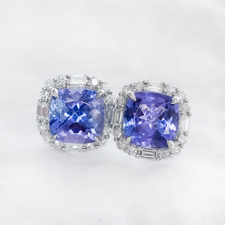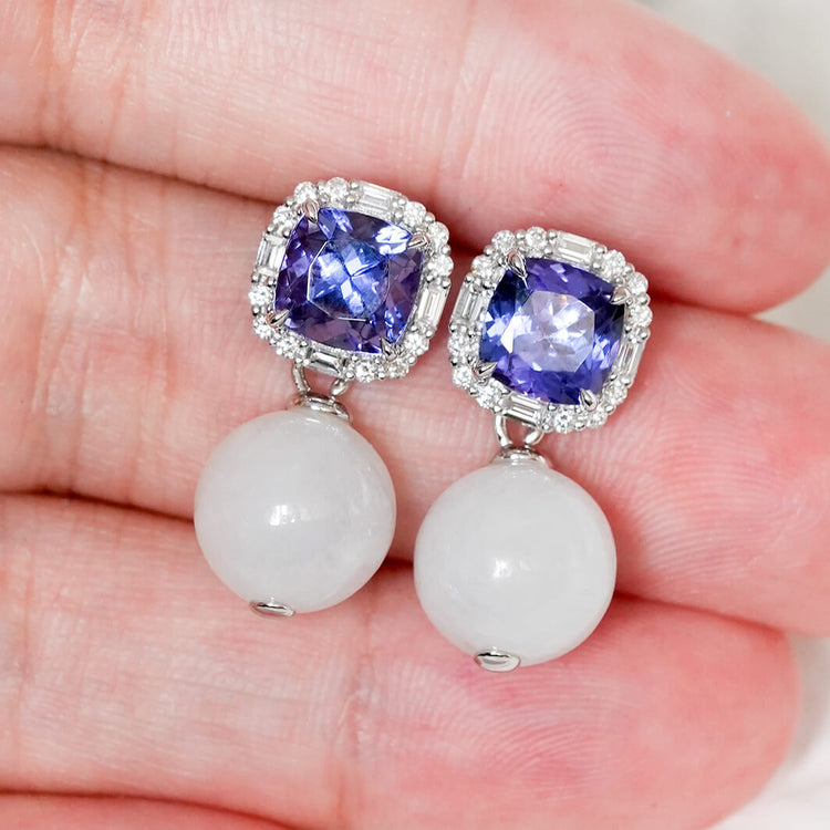 A stylish baguette and round Diamond halo for the most exquisite pair of Tanzanite gems. The stunning vivid violet blue you see on your screen is for real. We made these with hidden mousetails that you can dangle Pearls and Jade from. Made with 14K white gold for durability because these will last longer than any trends and are definitely a worthy family heirloom.