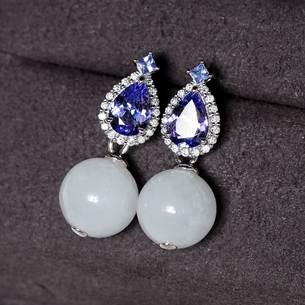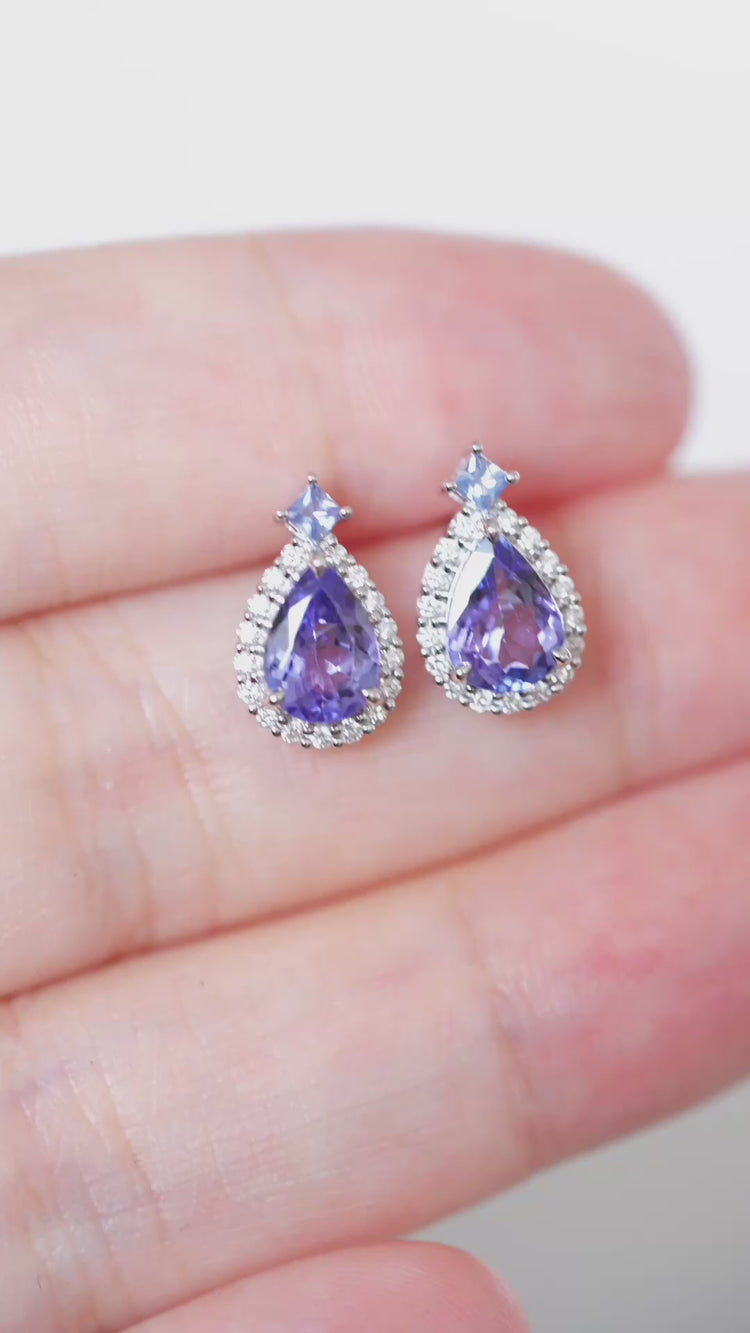 Look and feel like a royal with these stunning dewdrop shaped Tanzanite Diamond halo earrings with a modern twist - a princess-cut blue Sapphire at the top. We made these with hidden mousetails that you can dangle Pearls and Jade from. Made with 14K white gold for durability because these will last longer than any trends and are definitely a worthy family heirloom.