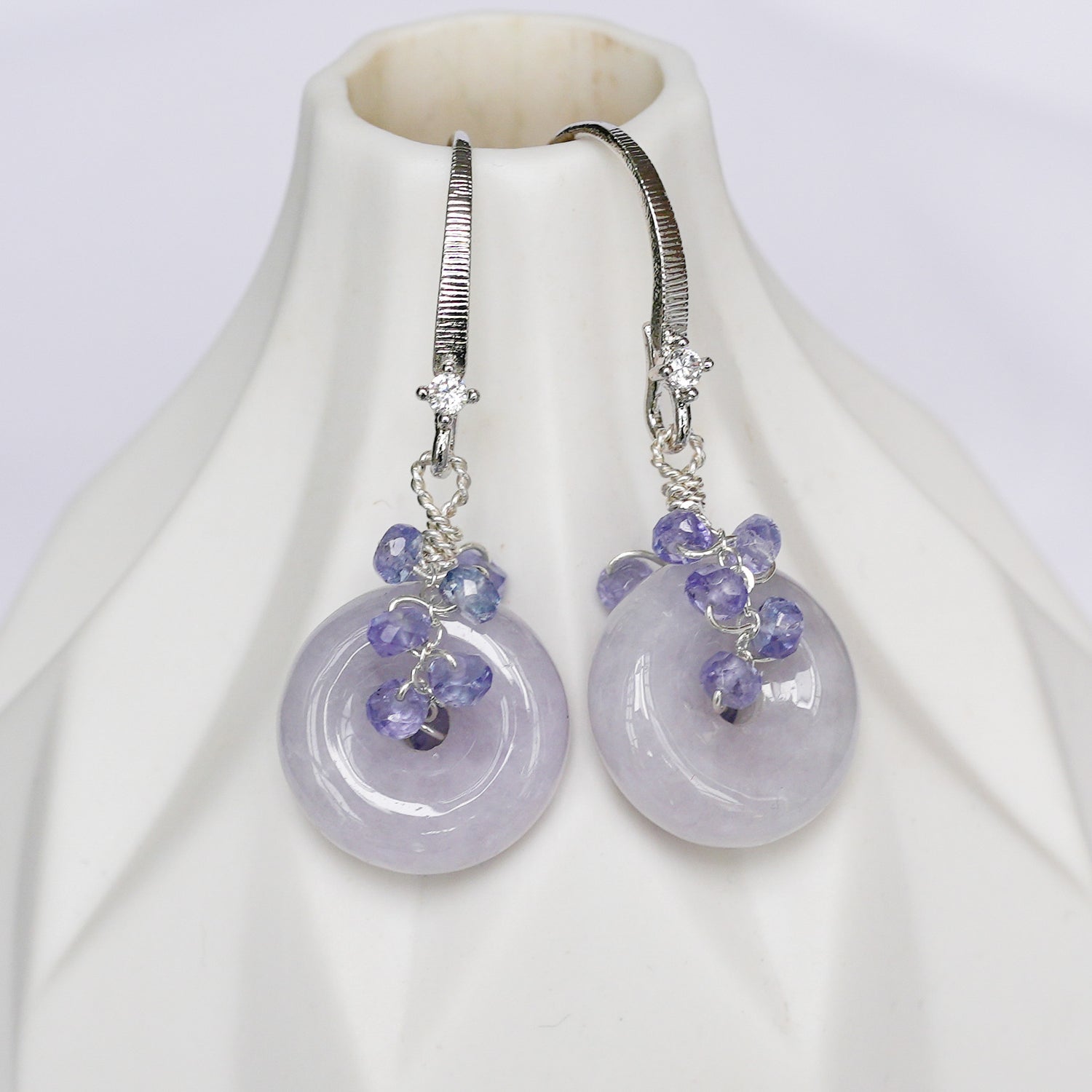 I made these Lavender Jade earrings for you, my fellow modern Jade lover. These vivid Lavender Jade donuts are cocooned in a vine of Tanzanite gems. They're really easy to dress up or casual, depending on your mood and the occasion.