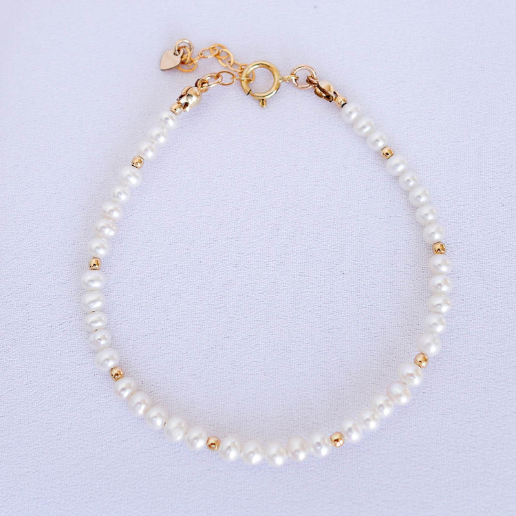 A bit of creamy lustrous Pearls and a bit of sparkly glint from metal accent beads. The best of both worlds on your wrist. You'll find that it wears great on its own or even stacked with other bracelets.