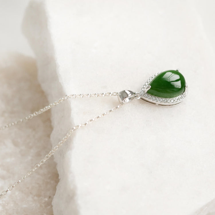 Radiating refined elegance, the Jade Halo Teardrop Necklace showcases a rich green Jade embraced by a halo of sparkling white cubic zirconia. We paired it with a more sturdy rolo chain. This timeless design brings together graceful curves and radiant shine and is perfect for adding a touch of elegance. Check out as "as worn" shots to see how it pairs beautifully with both casual and work fits!