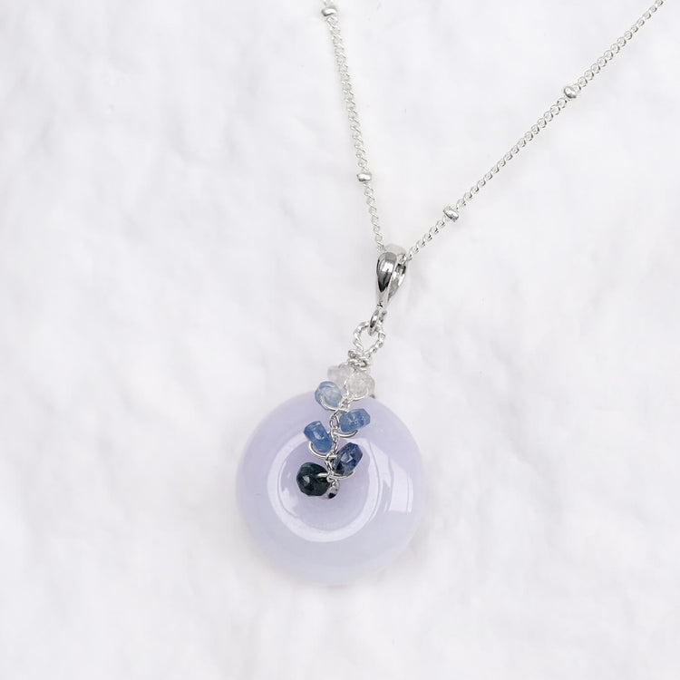We managed to lay our hands on this gorgeous Lavender Jade donut and wove a Sapphire vine through it. This necklace celebrates everything that is unique and one-of-a-kind while being modern and wearable.