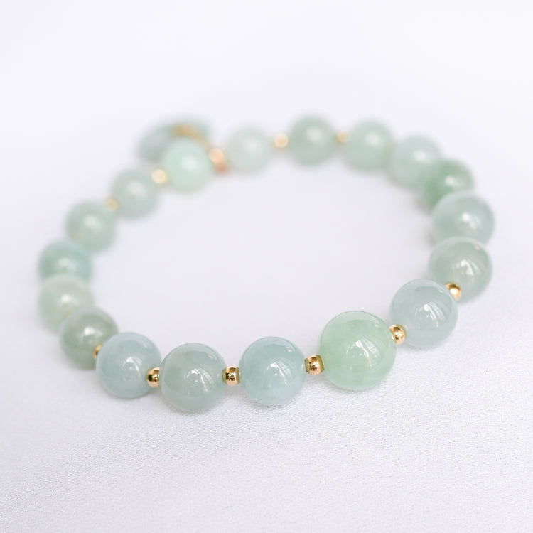 The Serene Jade Bracelet features a soothing trio of lavender, blue, and green Jade beads, each beautifully translucent and calming in tone. Alternating gold beads add a warm touch of refinement, while a gorgeous Jade donut dangle completes the piece with modern elegance. A harmonious design that feels as serene as it looks.