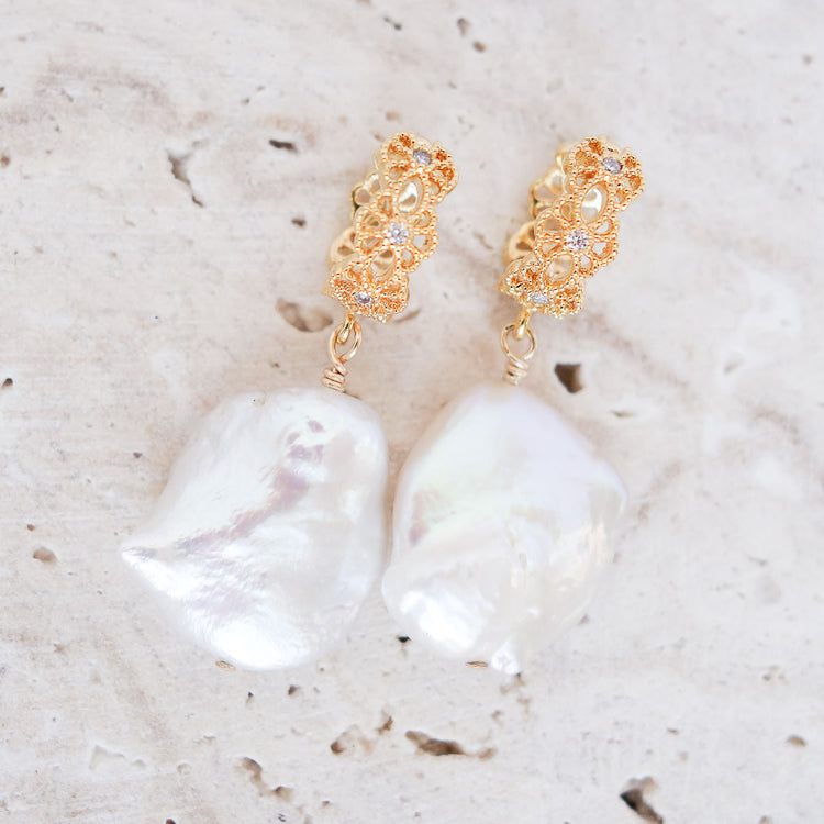Crafted with beautiful, lustrous baroque-shaped white Keshi pearls and timeless peranakan-inspired ear hoops, Large Keshi Pearl Earrings create a sophisticated and distinctive look. Suitable for formal and casual occasions, these earrings will surely add a chic touch to any ensemble. (Photo as worn is to show proportion and may not be the exact pair in this listing)