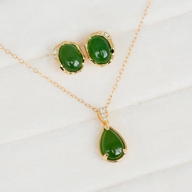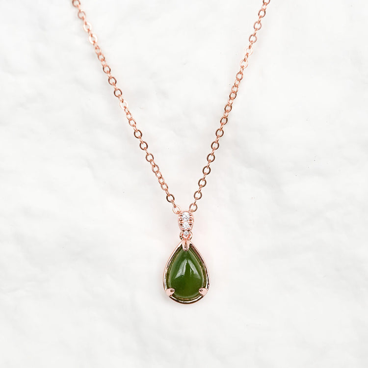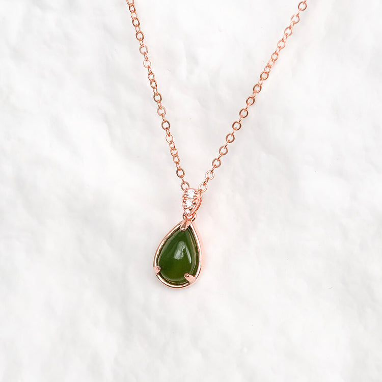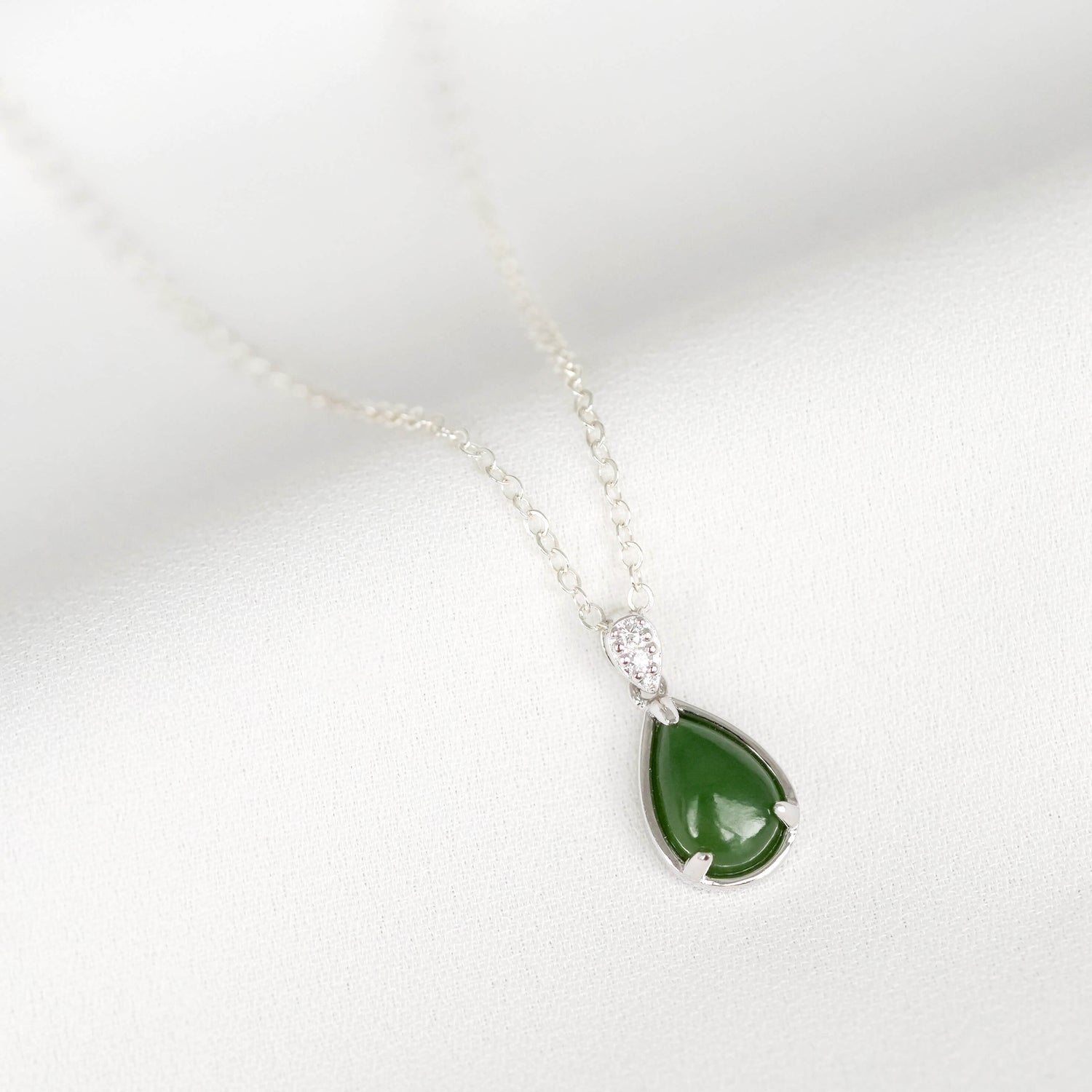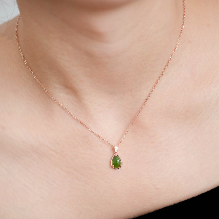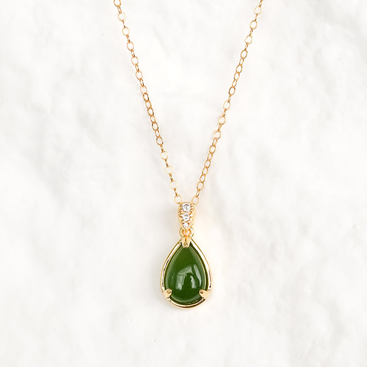 Elegant and understated, the Jade Raindrop Pendant Necklace features a gorgeous green Jade accented with sparkly pendant bail. It evokes the gentle beauty of falling rain and is a graceful everyday necklace with a timeless silhouette and a modern glow.