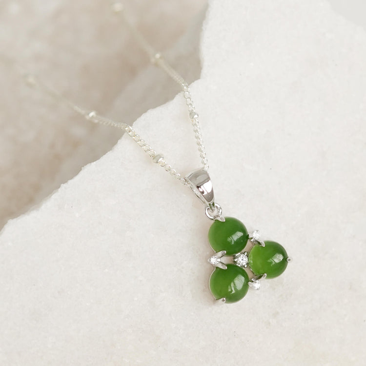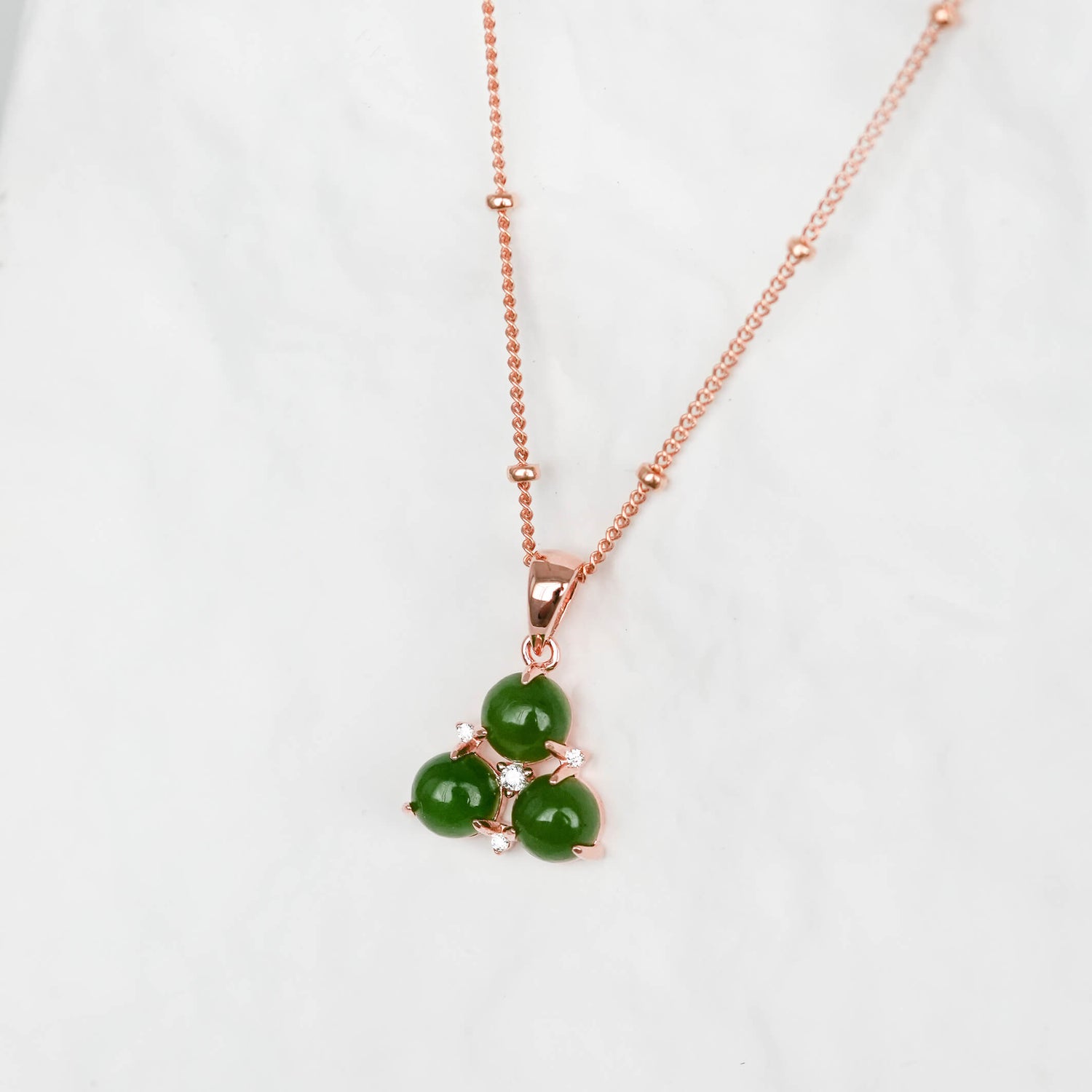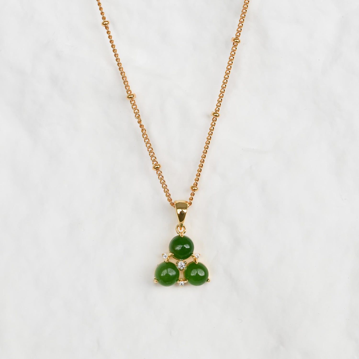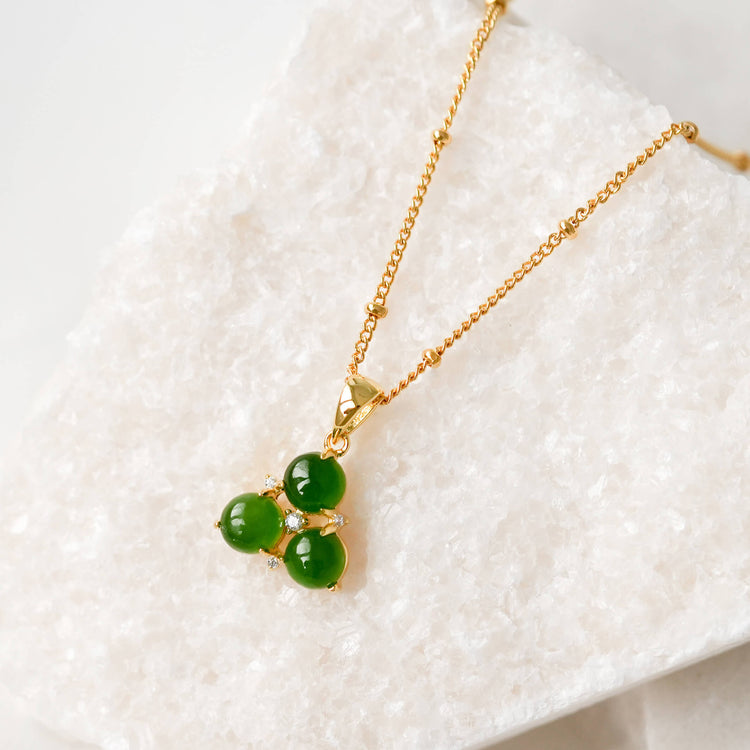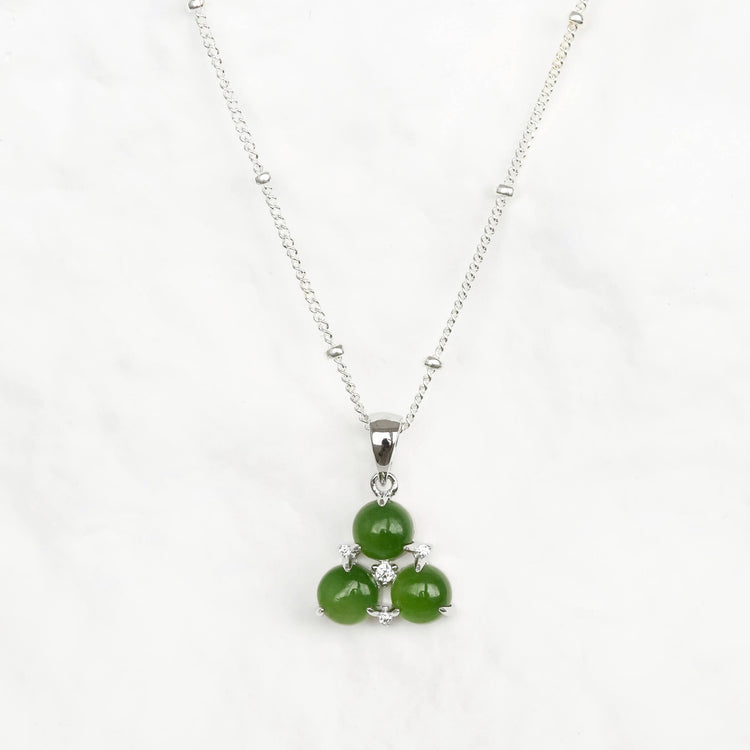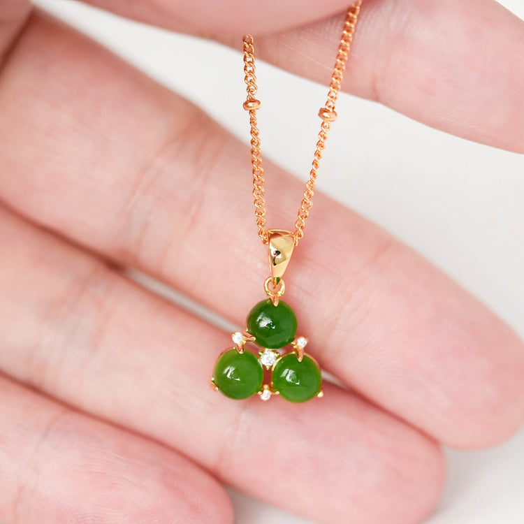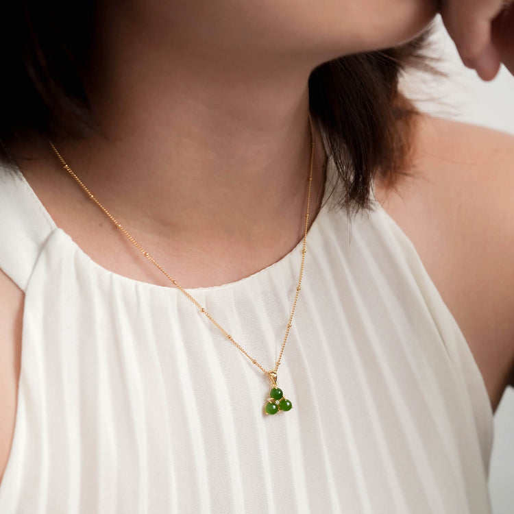 Symbolic and striking. Three rich green Nephrite Jade stones come together in a timeless trio, representing life’s journey — the past, present, and future. This necklace, on a pretty ball chain, is not just beautiful, it is also a beautiful reminder of every chapter that shapes you.