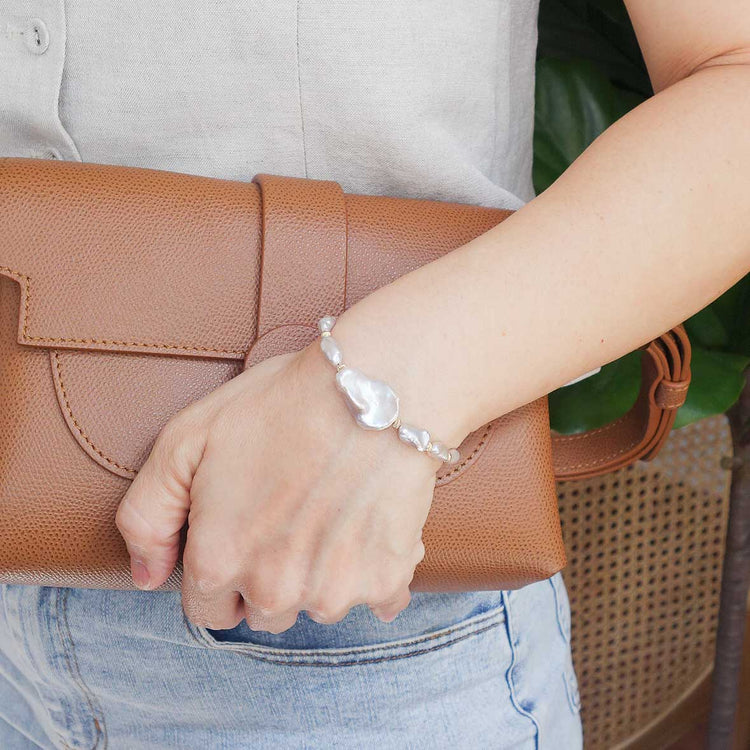 A statement Keshi Pearl grounds this bracelet. The lustre and rainbow iridescence of the pearls, along with their organic shapes make this bracelet truly one-of-a-kind.