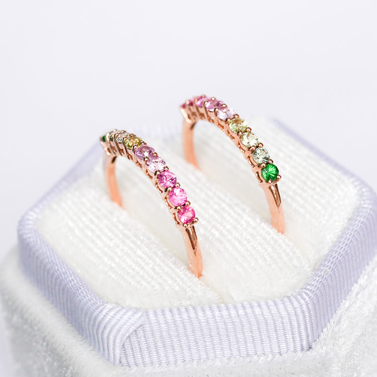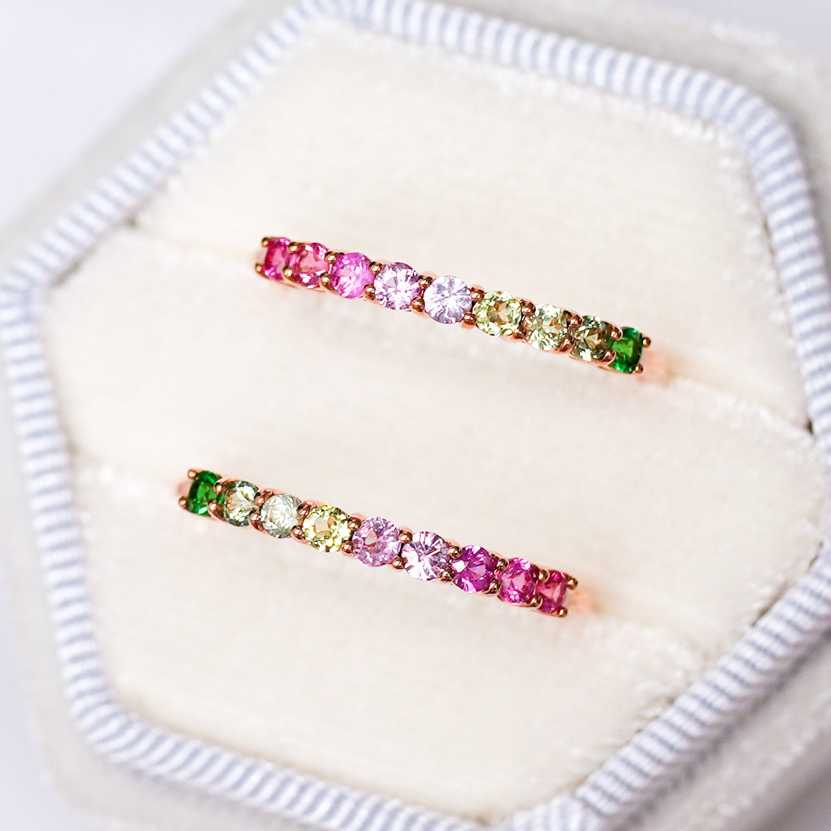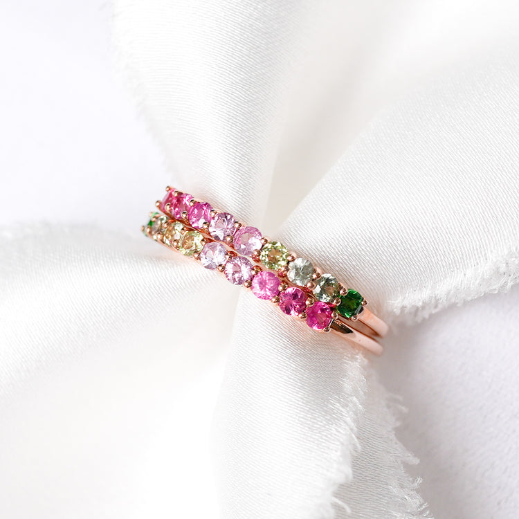 Inspired by my daughter's favourite strawberry matcha drink, this Milestone Ring combines pinks and greens in perfect harmony. Each gemstone, from Pink Sapphire and Pink Spinel to Peridot, Green Sapphire and Tsavorite, is carefully chosen for colour and clarity. The result: a piece that’s both whimsical and elegant, handcrafted for those who love fine jewellery with personality.