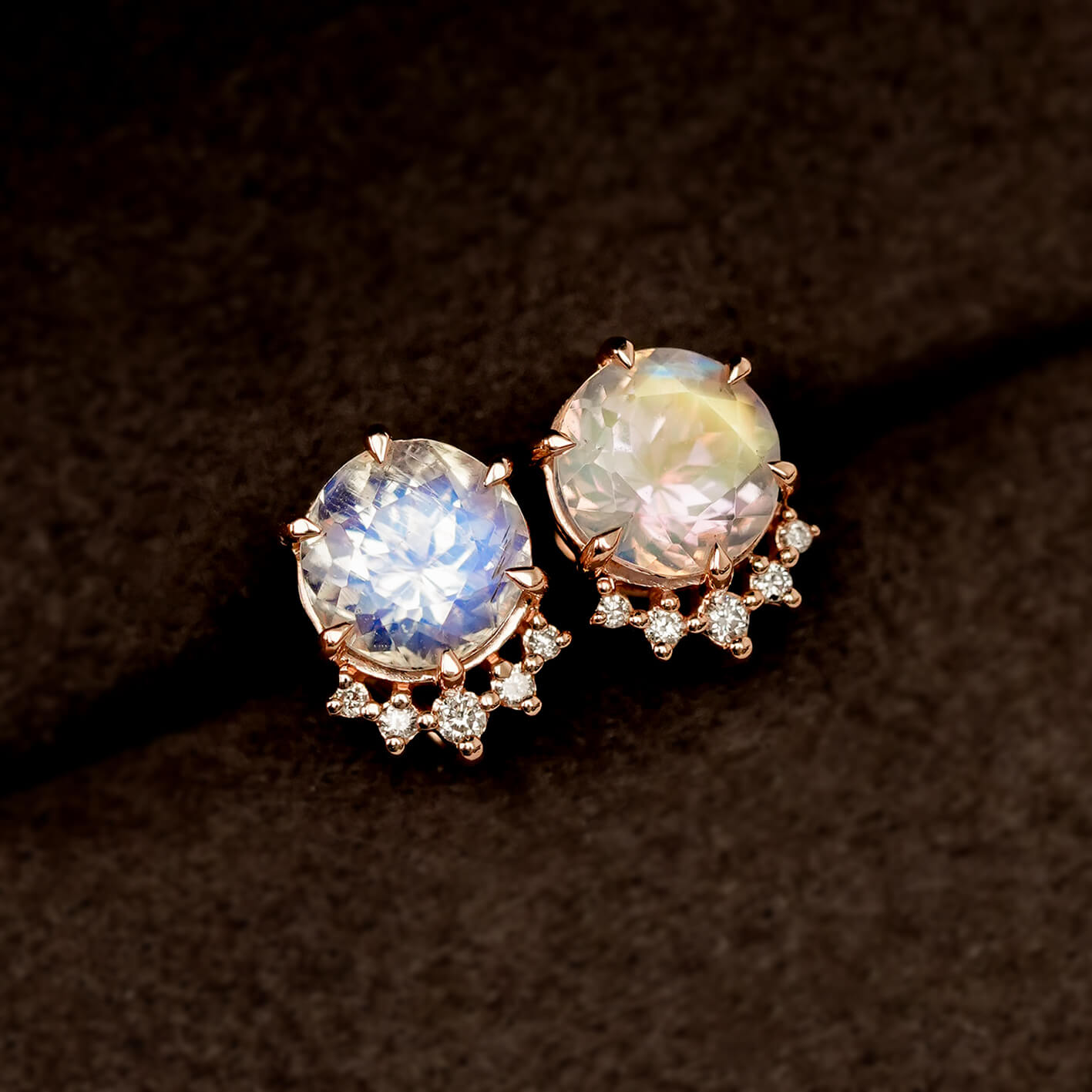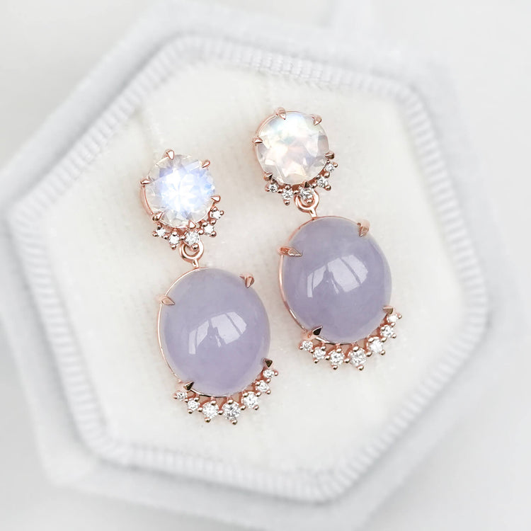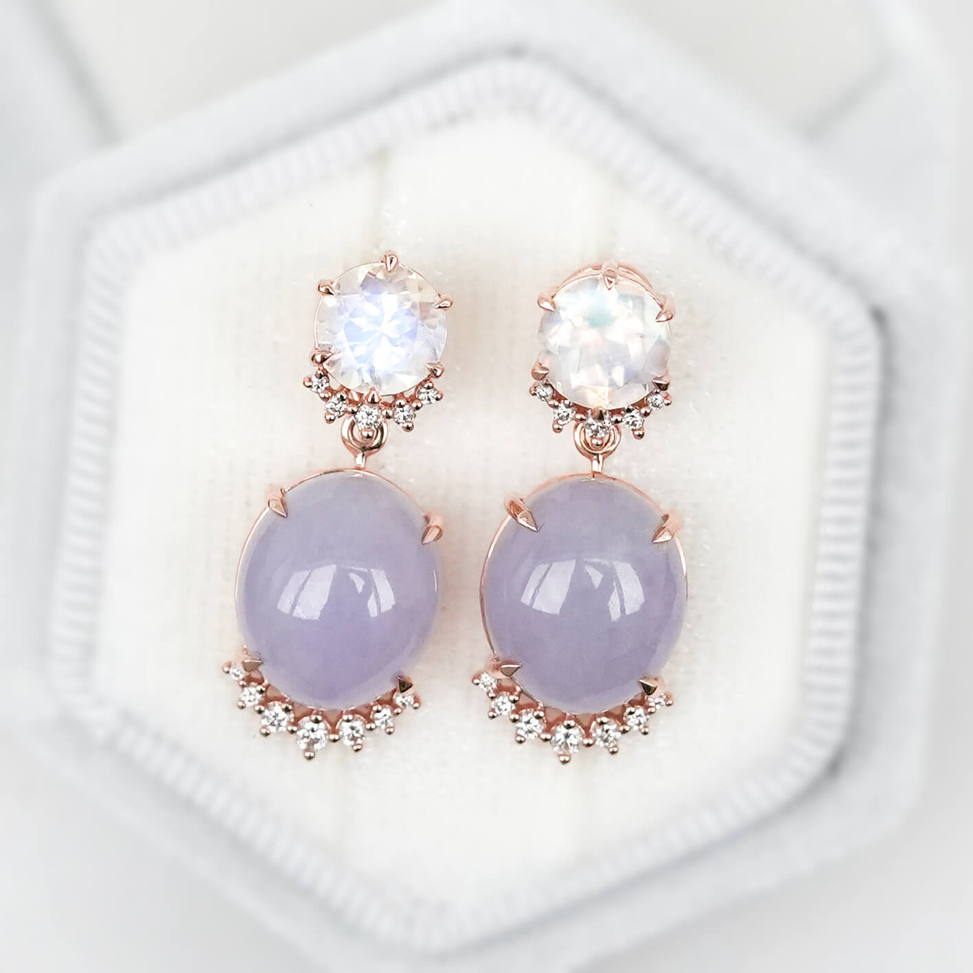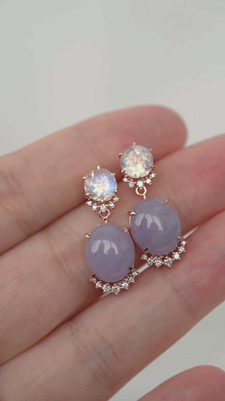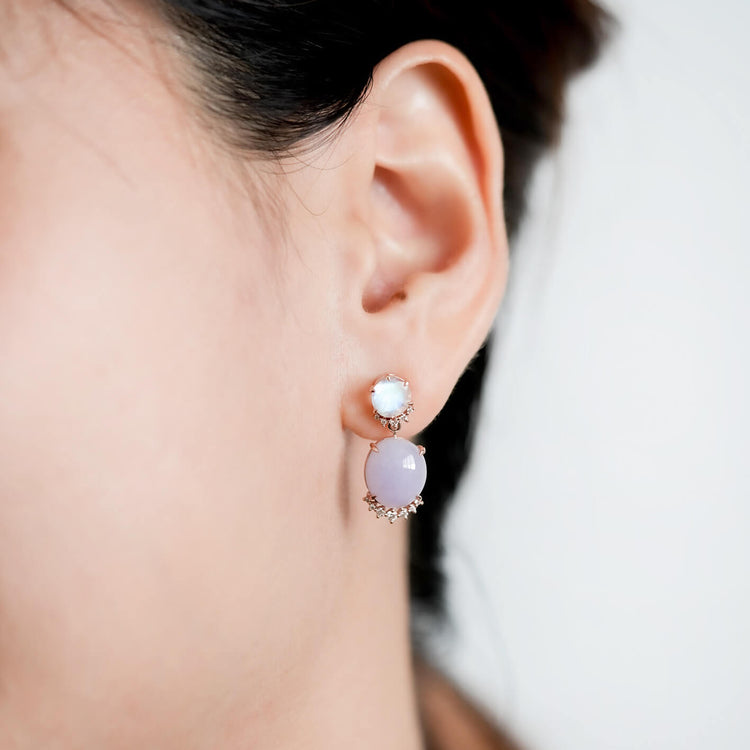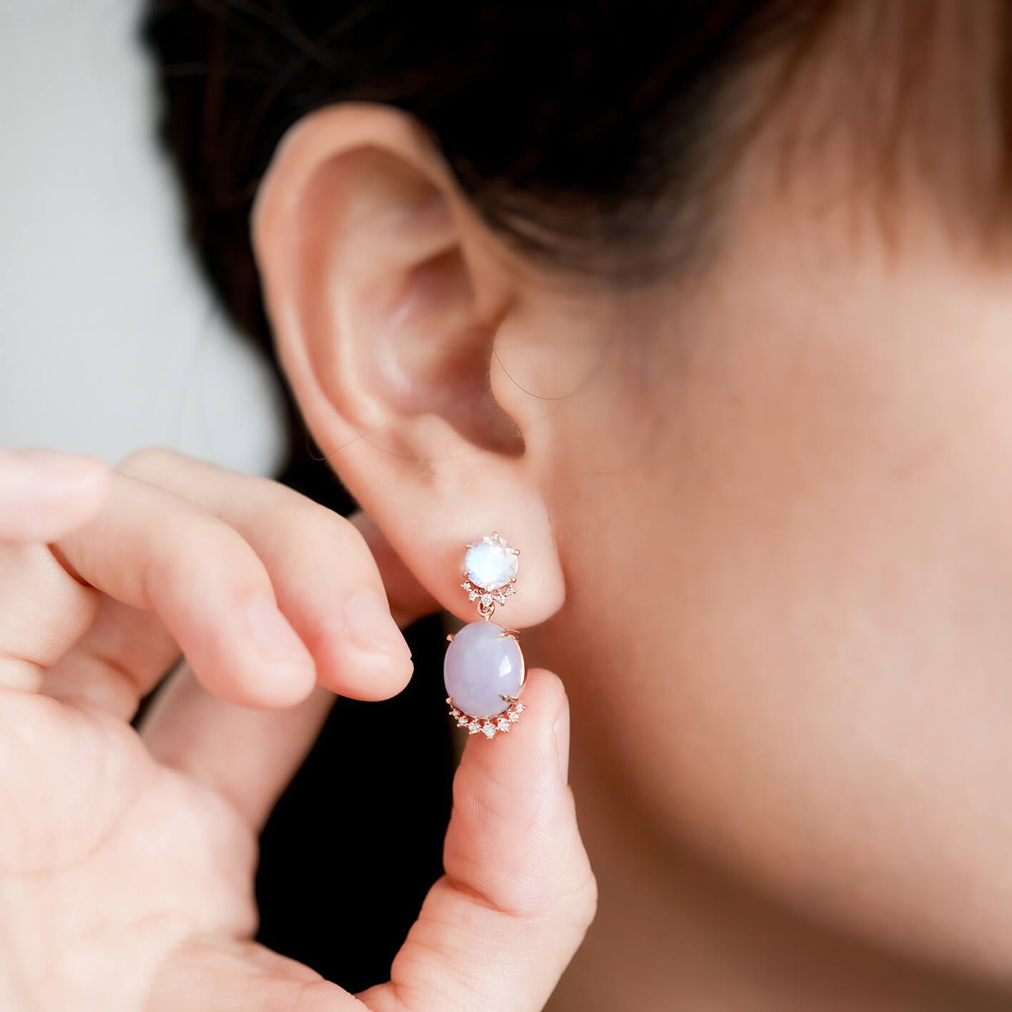 Set in 14k rose gold to enhance the natural warmth of the gems and provide lasting durability, this design offers both beauty and flexibility. The lavender Jade drops are detachable so you can wear the Moonstones alone as refined studs, or add the drops for a more dramatic look. The Jade gem drops can also be paired with other earrings featuring a mousetail backing, giving you multiple styling possibilities in one timeless pair.