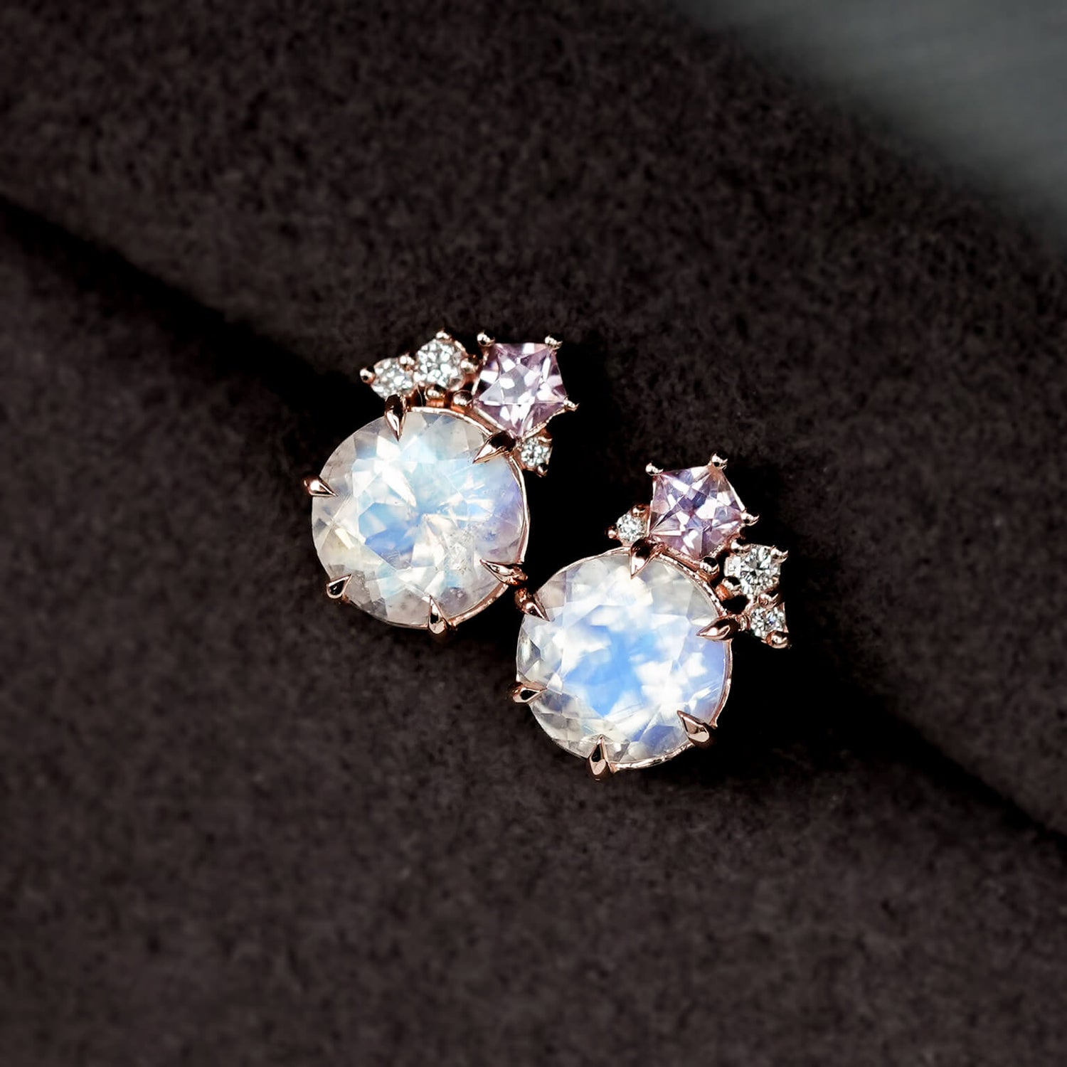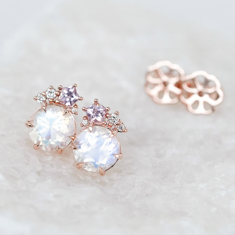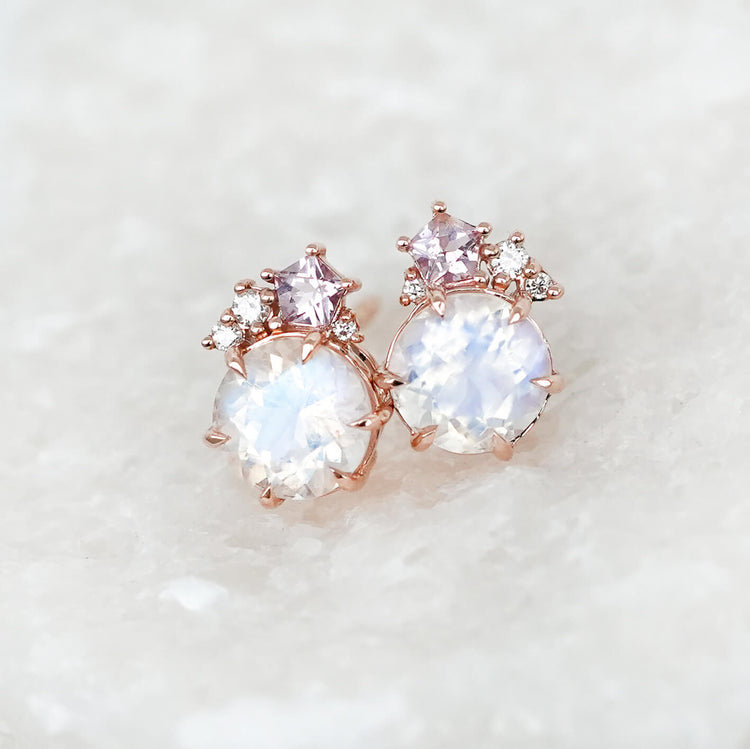 A pair of gorgeous faceted round Moonstone glows at the centre of these earrings, gently “kissed” by a delicate sprinkling of spinel and diamonds along one side. This subtle constellation of sparkle adds a romantic, celestial touch to the design. Set in 14k rose gold to enhance the moonstone’s natural warmth and provide lasting durability, this pair is a graceful balance of softness, shimmer, and timeless elegance.