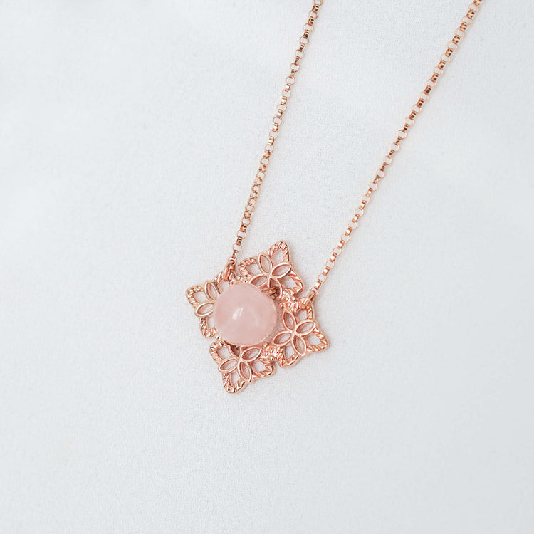 A touch of old-world romanticism encapsulated in this intricate peranakan-inspired necklace featuring a soft pink Rose Quartz bead.