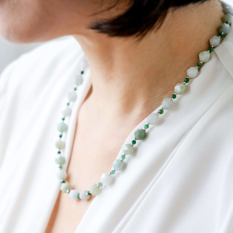 A modern Jade necklace that goes with both formal and casual outfits. Fitted with an easy-to-wear clasp in silver.