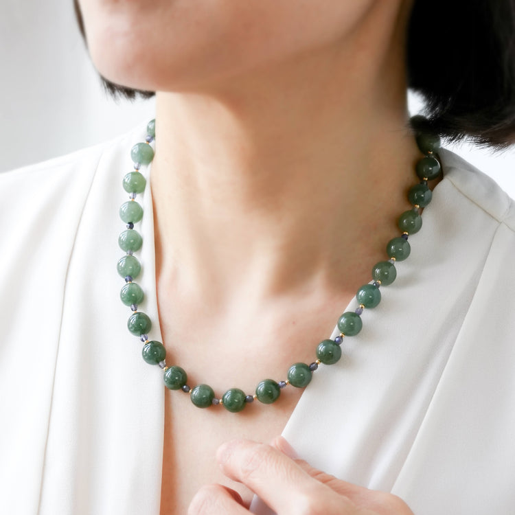 Every Jade bead tells a story in this necklace. I handpicked translucent sage green and forest green Jade beads and arranged them in ombre tones. They are accented with Iolite. Together with an easy-to-wear clasp, this necklace is modern and sophisticated.