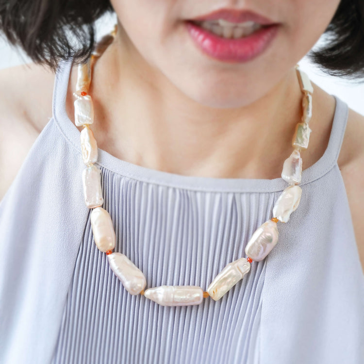 Elegant, timeless and chic. Nothing speaks sophistication than this simple yet stunning statement Pearl necklace. Mexican Fire Opal gem accents bring out the peachy tone of the Pearls beautifully.