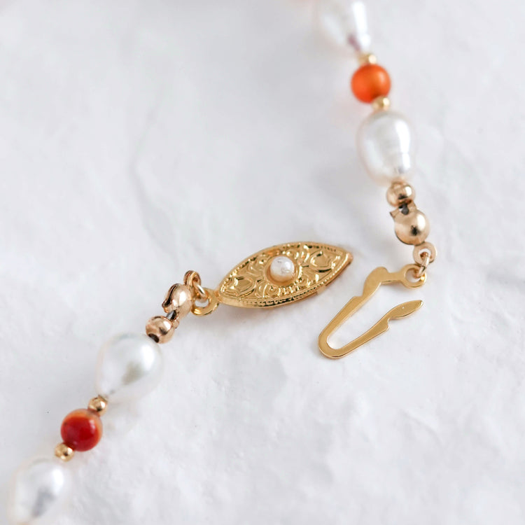This joyful looking Pearl and Agate necklace features a gorgeous ornate clasp that can be worn at the side or front as part of the necklace design.