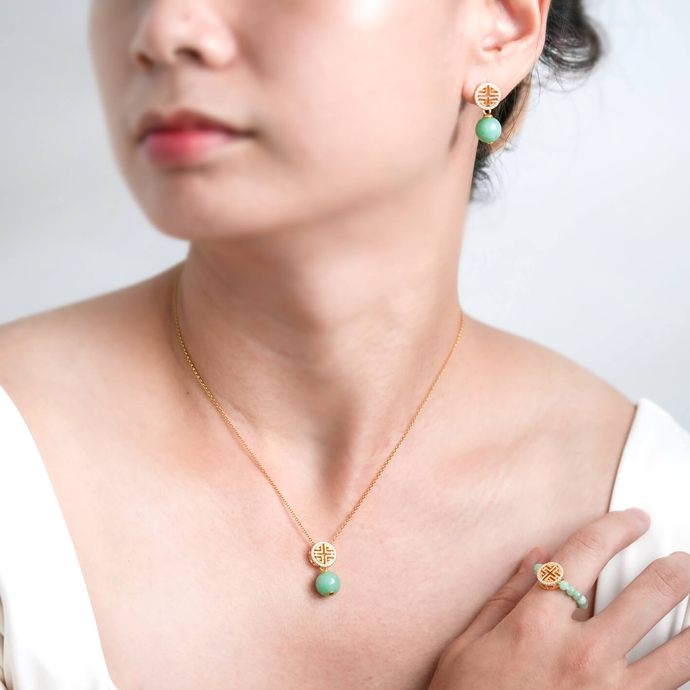 Crafted with vivid green jade that have been hand-selected for its luminous depth, this elegant set features our specially designed Lu (禄) symbol, representing prosperity from the traditional “Fu Lu Shou” trinity.