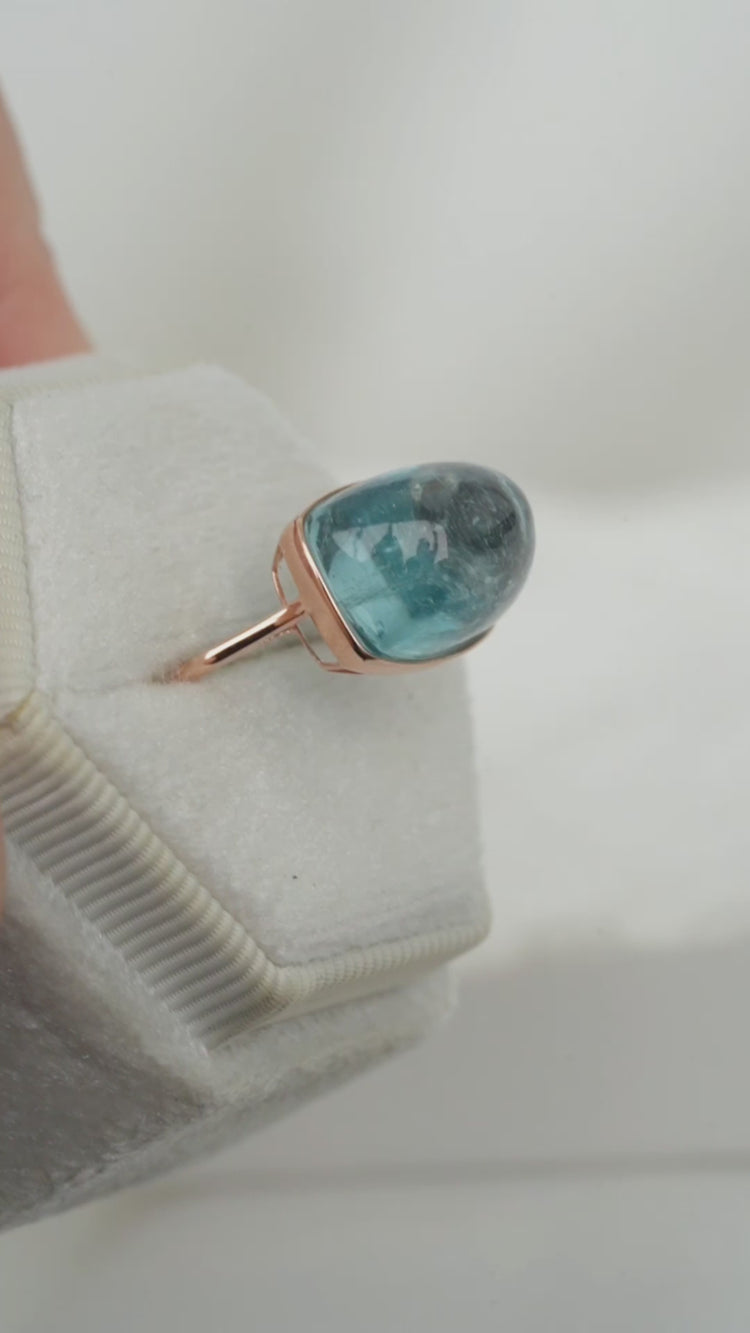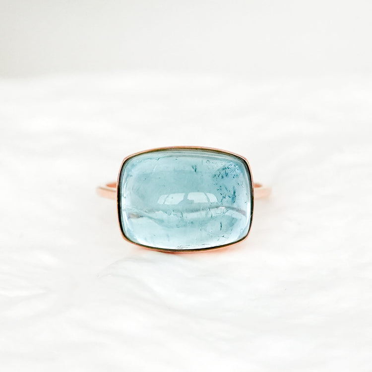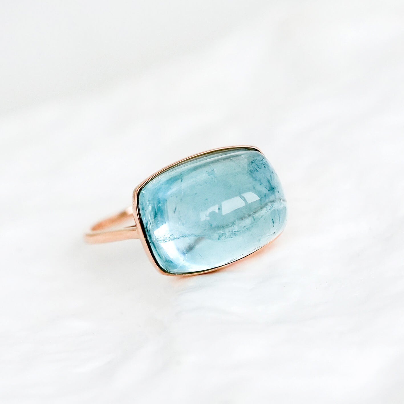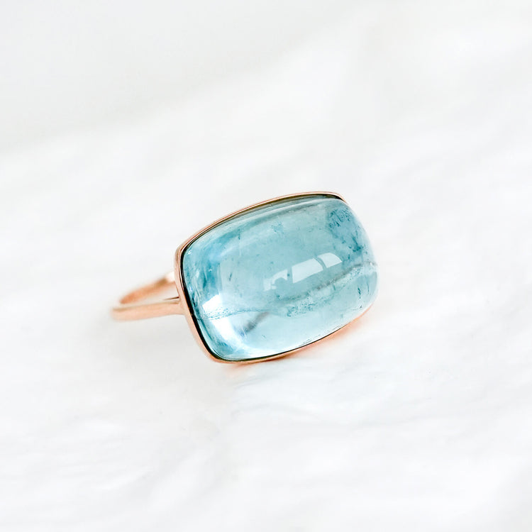 If you ever needed a statement ring that radiates confidence, this 11.7-carat aquamarine is it. Natural inclusions within the gem add depth and individuality, enhancing its character. Simply set on a 14k rose gold band, the bold cabochon has an assertive presence yet carries a whimsical, candy-like charm. It’s this playful juxtaposition of strength and sweetness that makes the ring so irresistibly captivating.