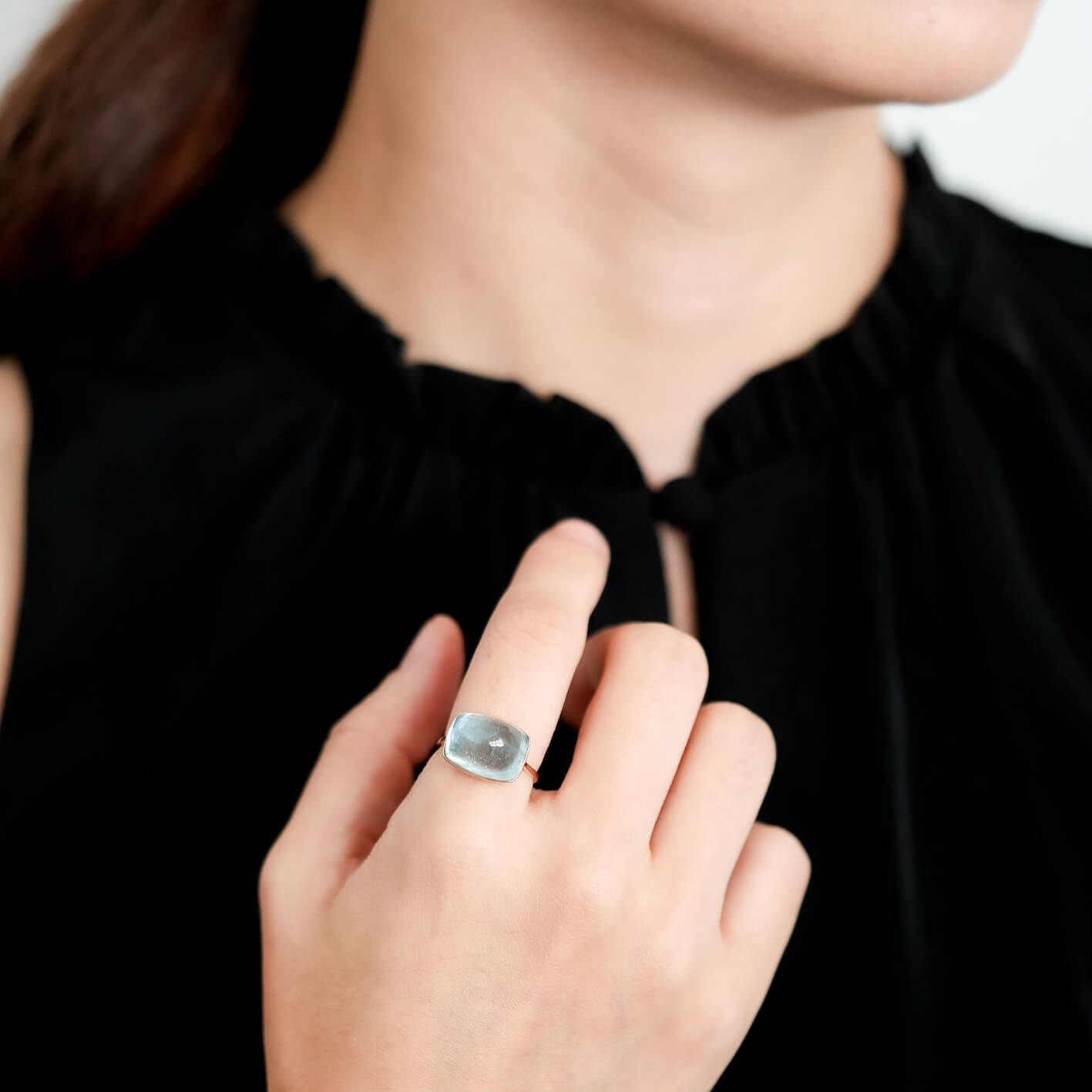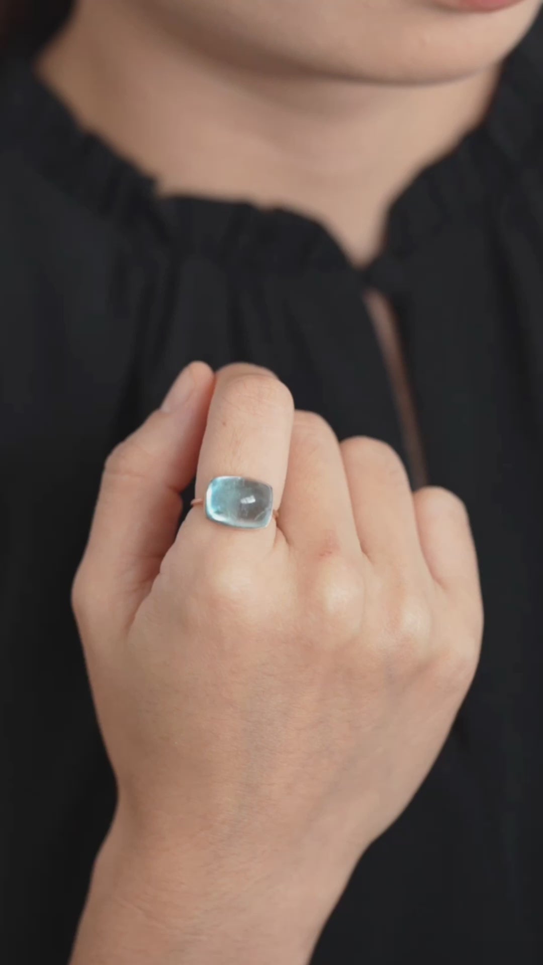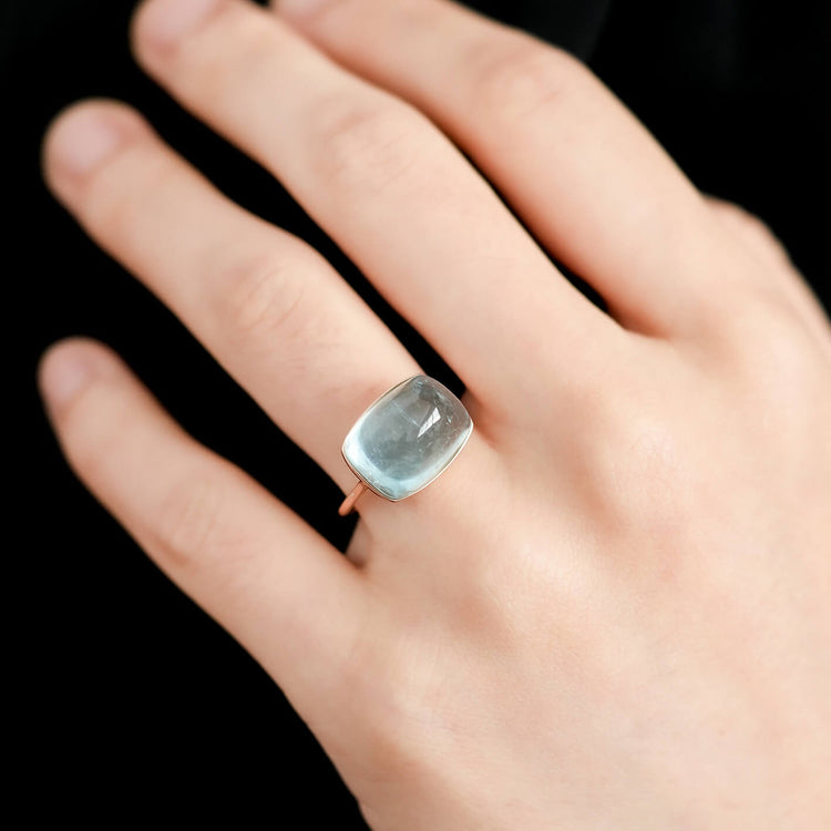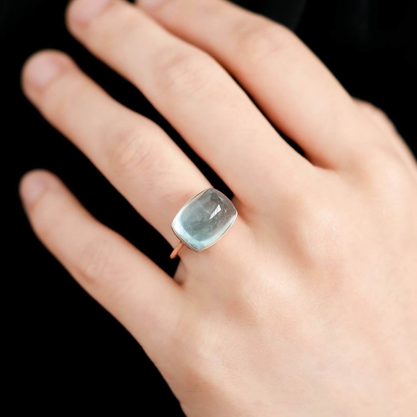 If you ever needed a statement ring that radiates confidence, this 11.7-carat aquamarine is it. Natural inclusions within the gem add depth and individuality, enhancing its character. Simply set on a 14k rose gold band, the bold cabochon has an assertive presence yet carries a whimsical, candy-like charm. It’s this playful juxtaposition of strength and sweetness that makes the ring so irresistibly captivating.