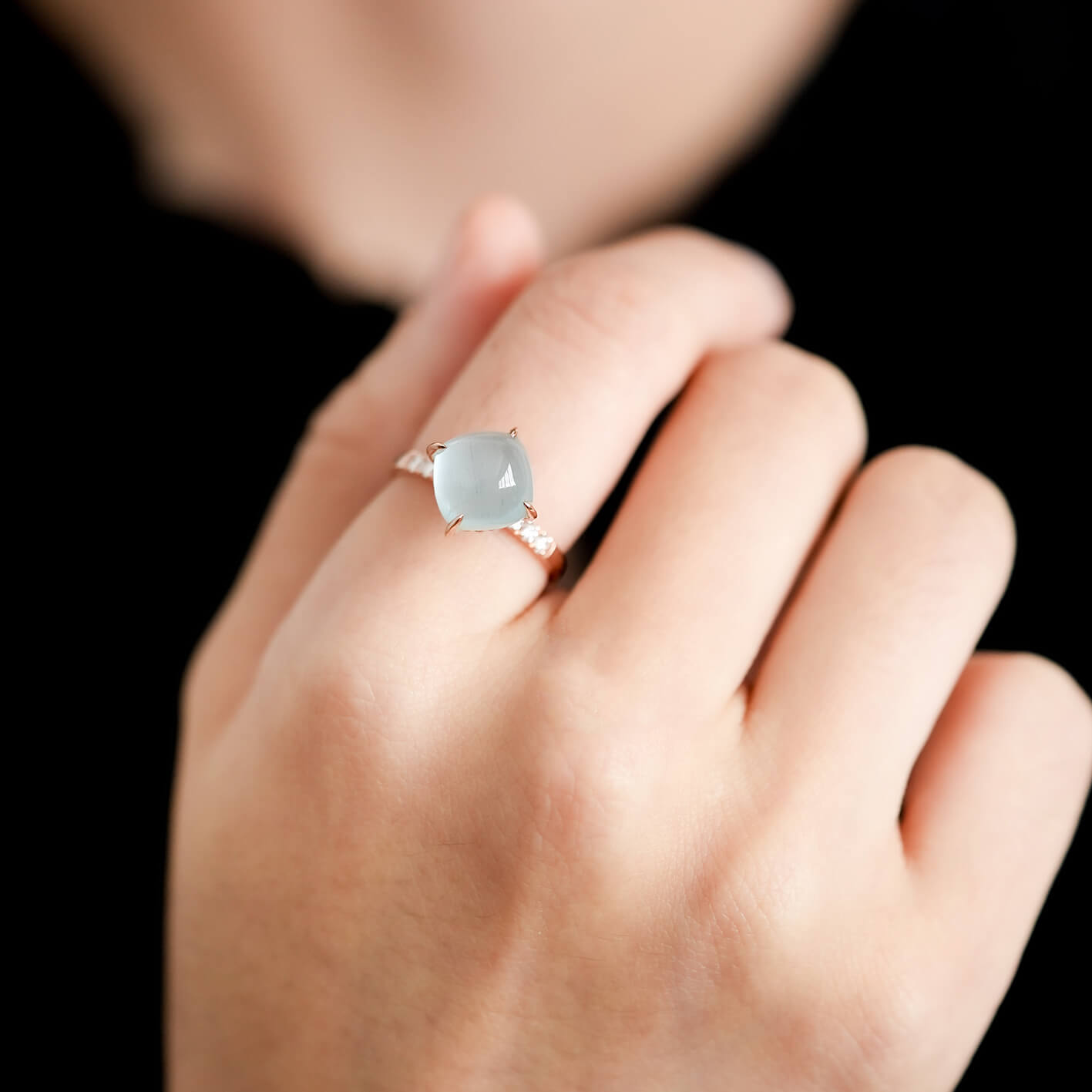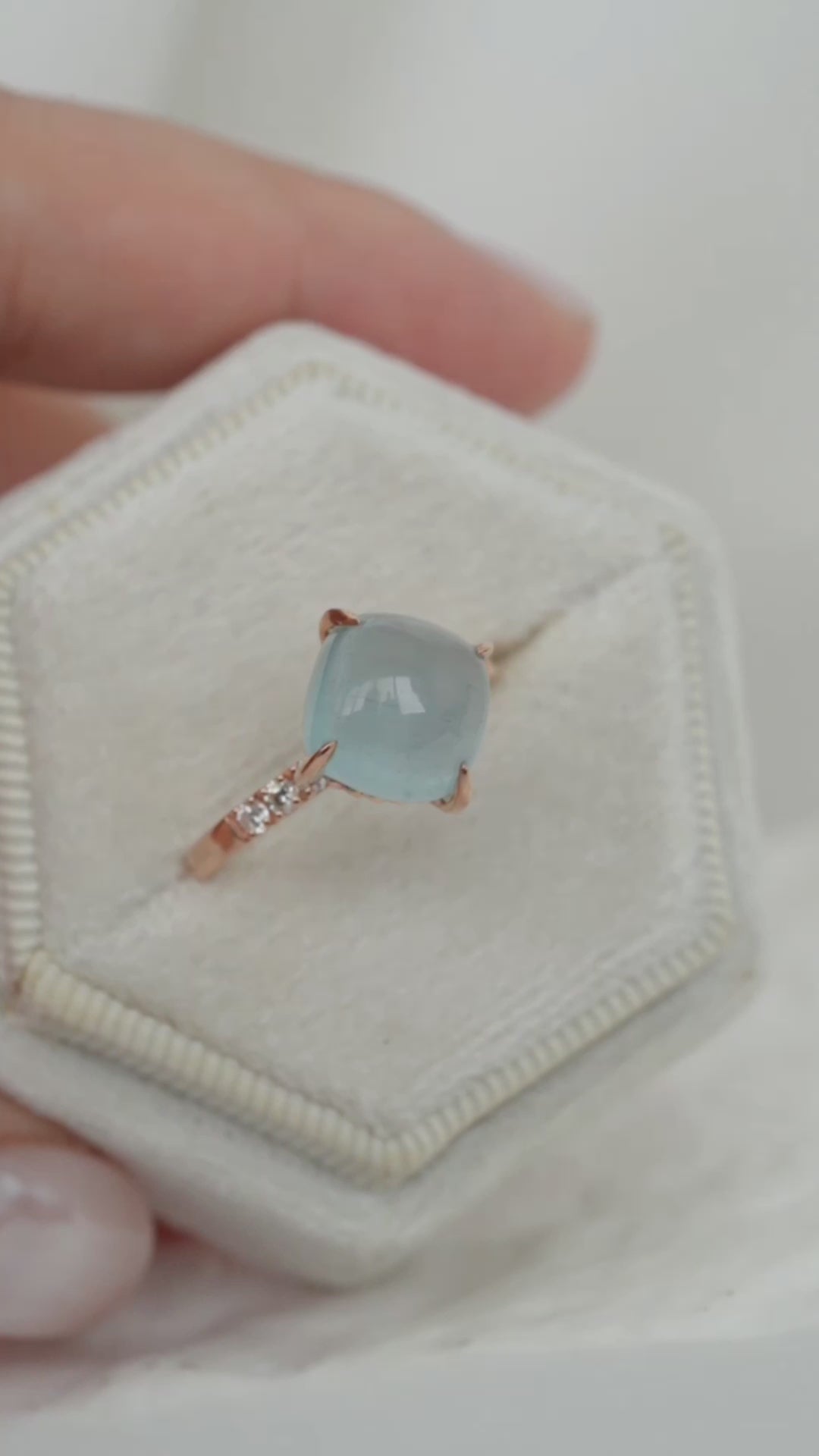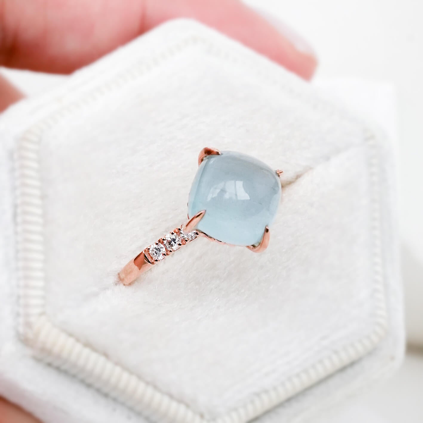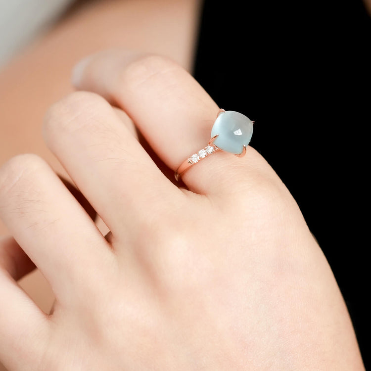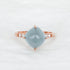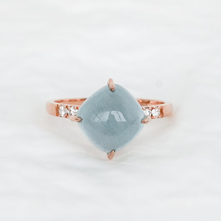 A lovely cushion Aquamarine is set slightly higher to showcase its brilliance, resting above a ring band adorned with a radiant line of Diamonds. Intricate braided detailing beneath the gem adds depth, craftsmanship, and unexpected charm to the design. Crafted in 14k rose gold, this statement ring blends softness, sparkle, and artistry into a standout piece made to turn heads.