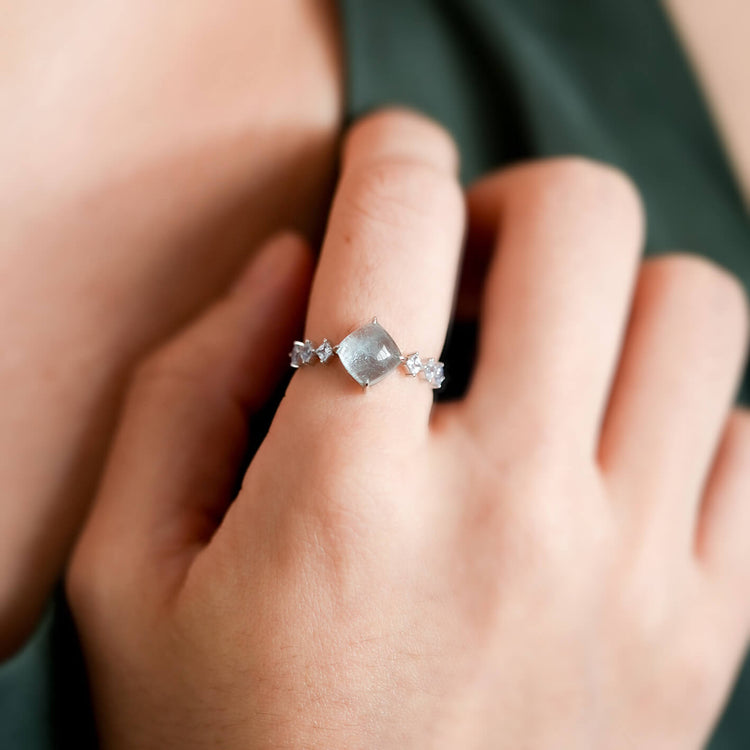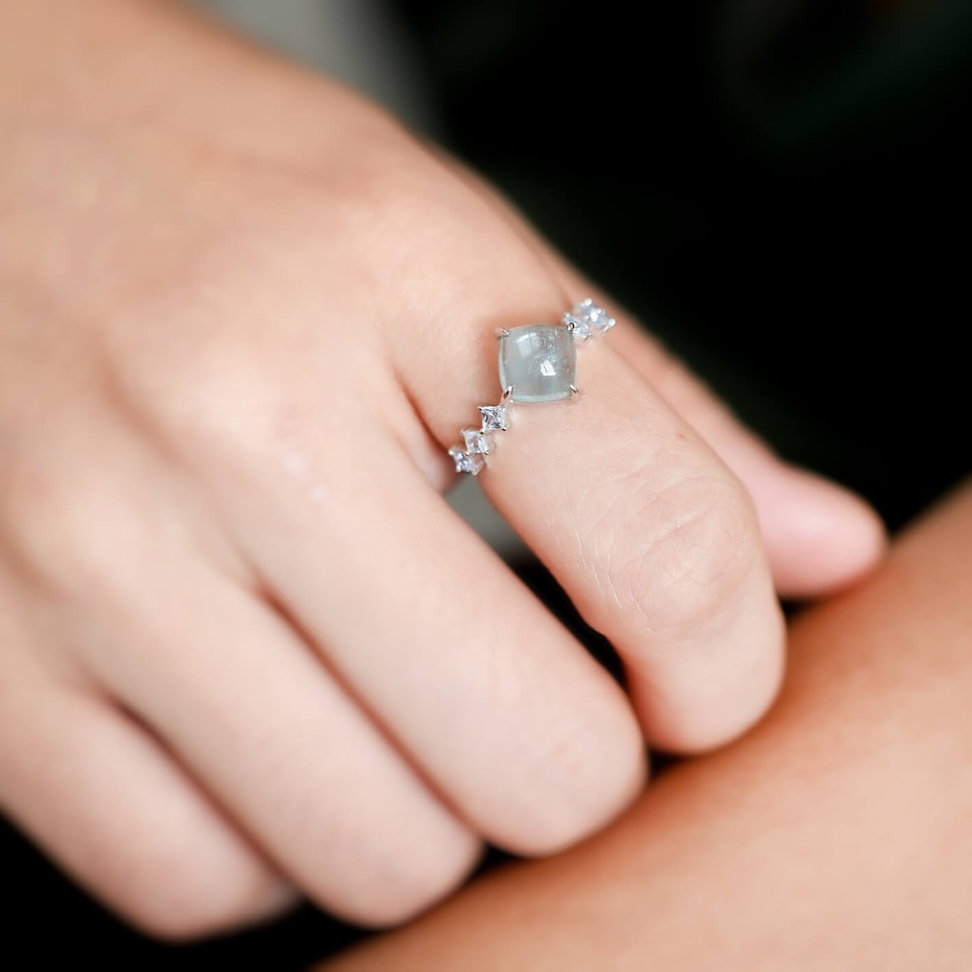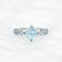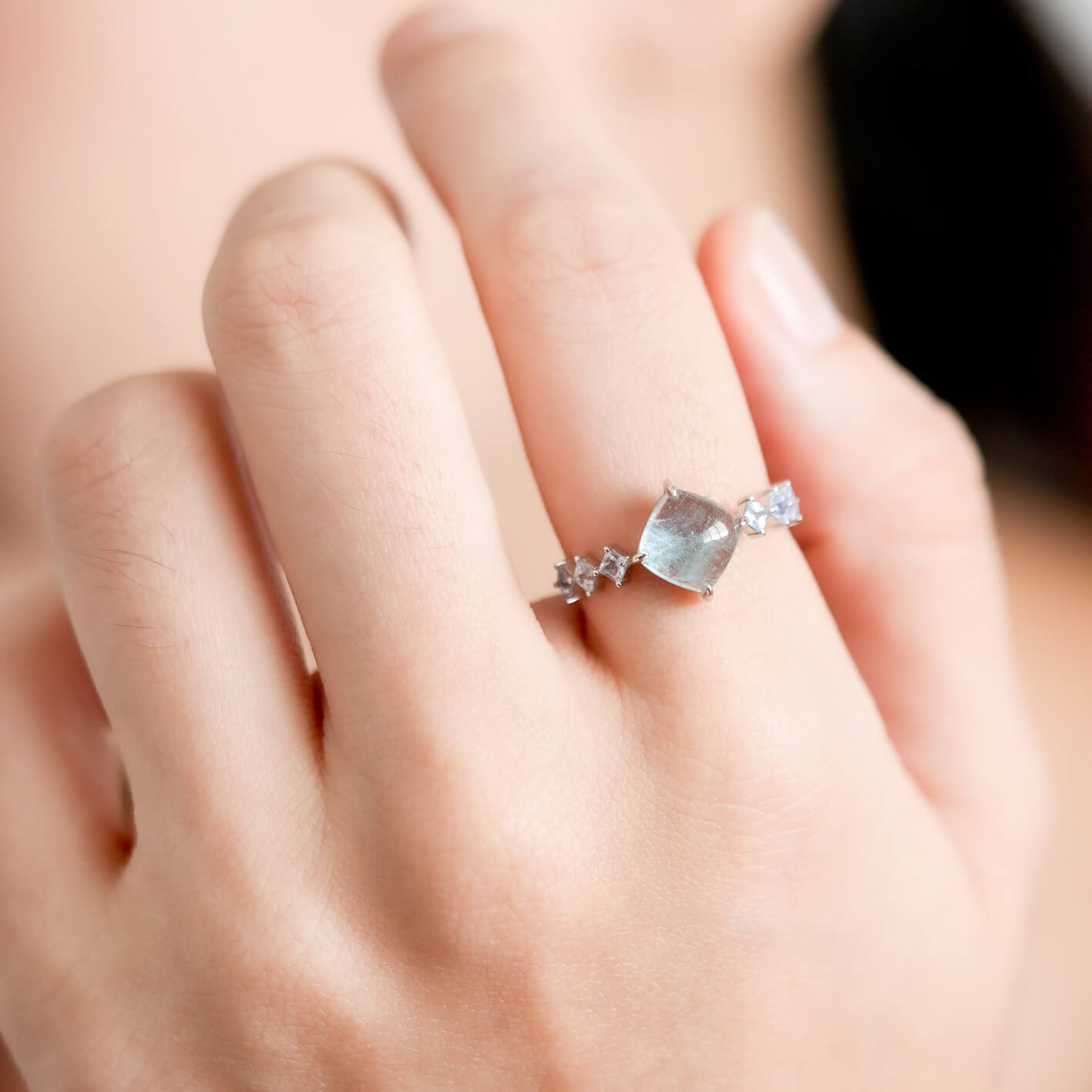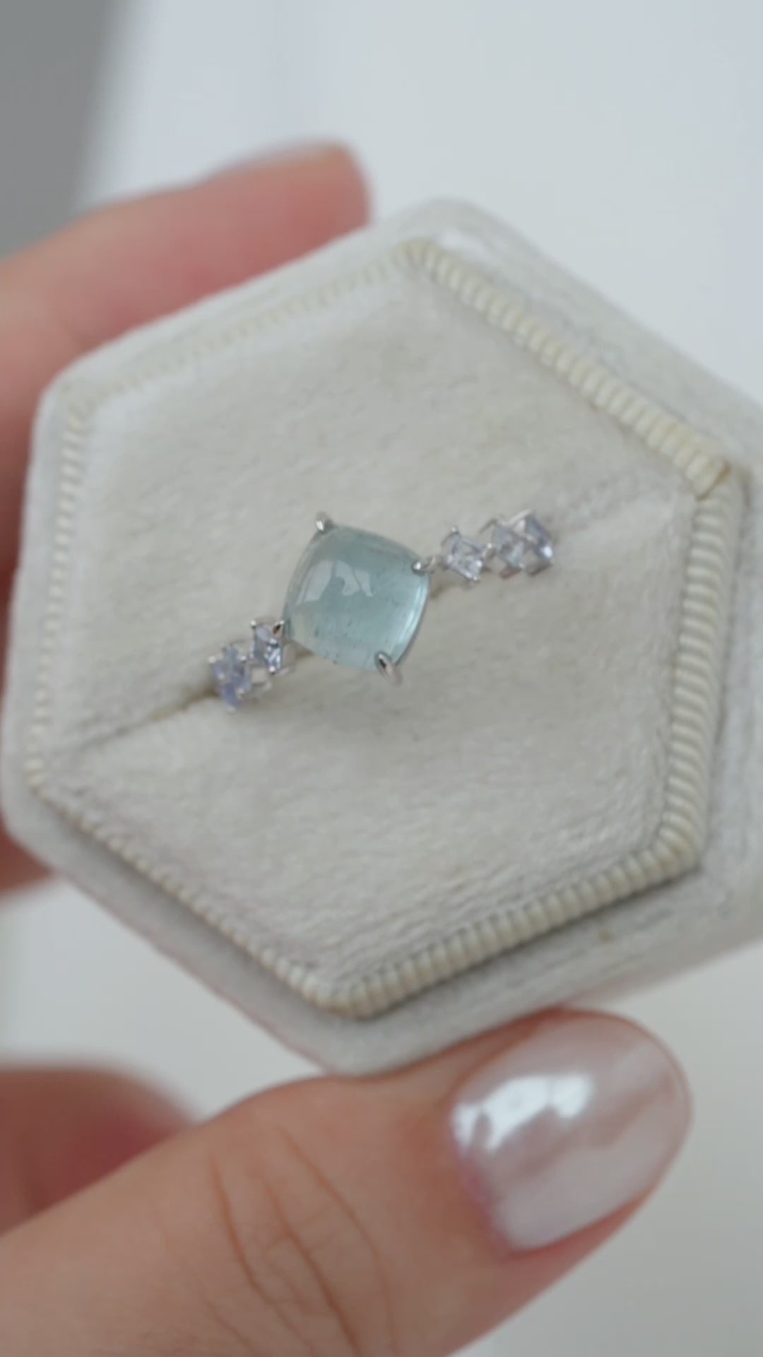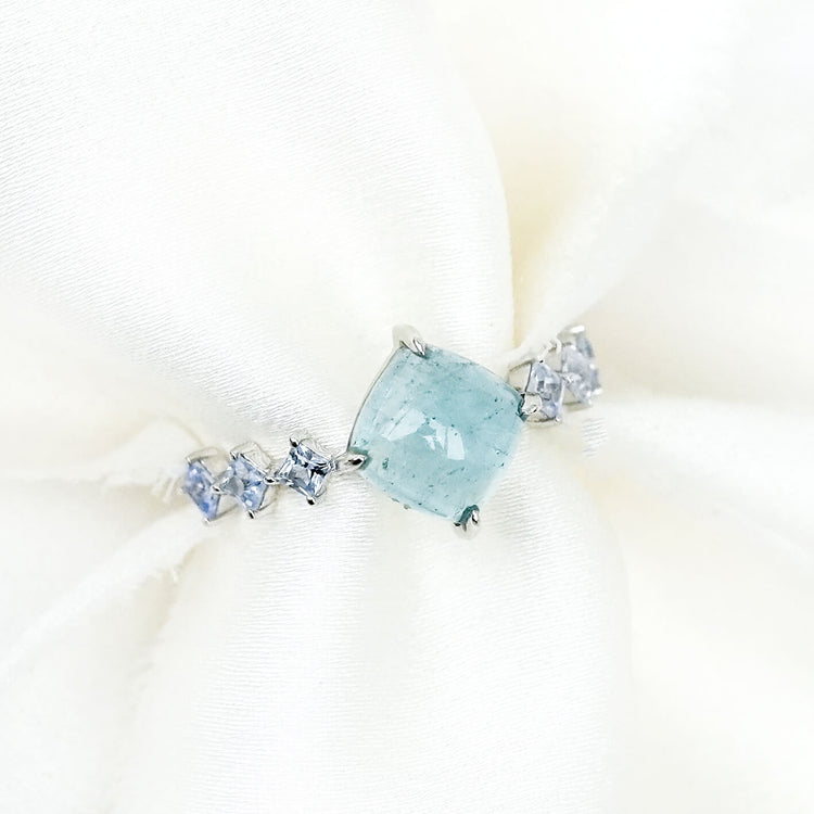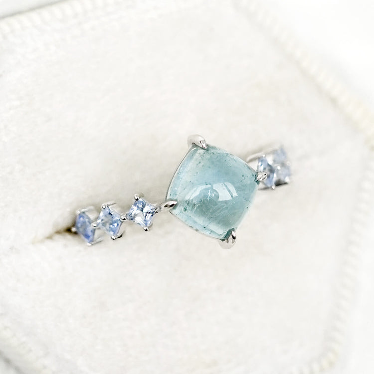 A captivating cushion Aquamarine sits at the heart of this ring, its natural inclusions adding character and individuality to the gem. The band is adorned with square ombré blue Sapphires, creating a smooth gradient of colour that enhances the Aquamarine’s serene blue tones. Crafted in 14k white gold for a cool, refined finish, this ring is a modern classic—striking, sophisticated, and effortlessly timeless.