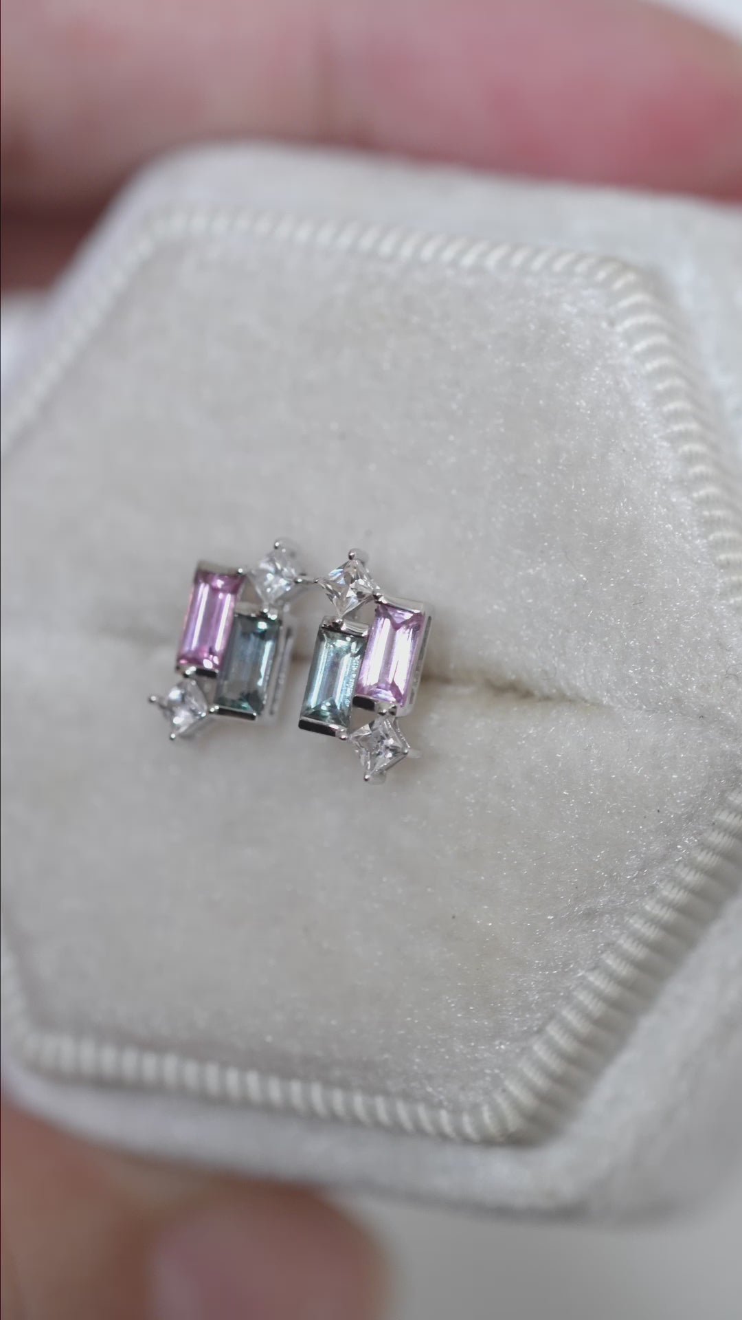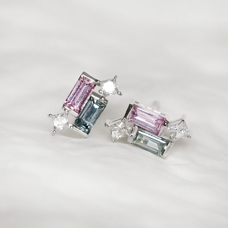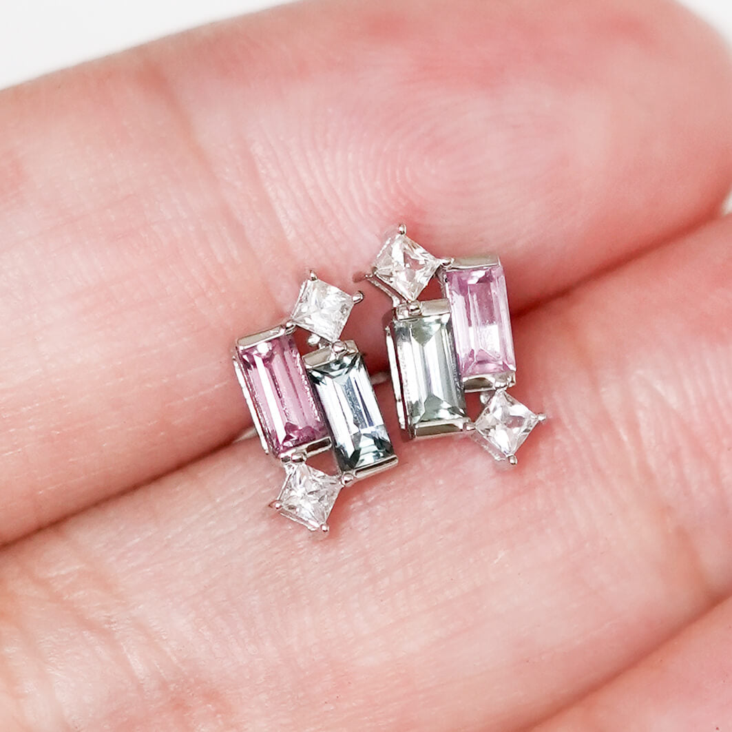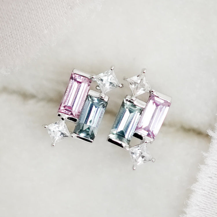 A joyful twist on a beloved design. This pair features pink and teal Sapphire baguettes set in solid 14K white gold, creating a vibrant yet refined contrast.