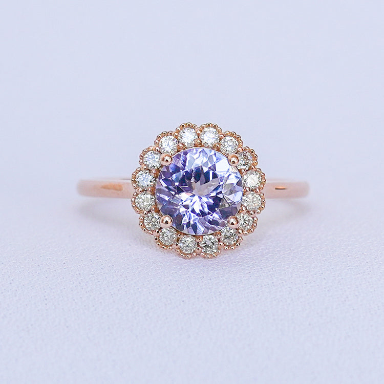 A rare treasure of natural beauty, this design features an unheated lavender tanzanite, admired for its delicate lilac hue and untouched purity. The centre stone is cocooned in a bezel of fine diamonds, each accentuated by a milgrain edge that lends a vintage-inspired charm. The halo’s intricate detailing enhances the gemstone’s soft brilliance while adding a refined touch of texture. Elegant yet distinctive, this piece combines timeless craftsmanship with the rare allure of untreated tanzanite.