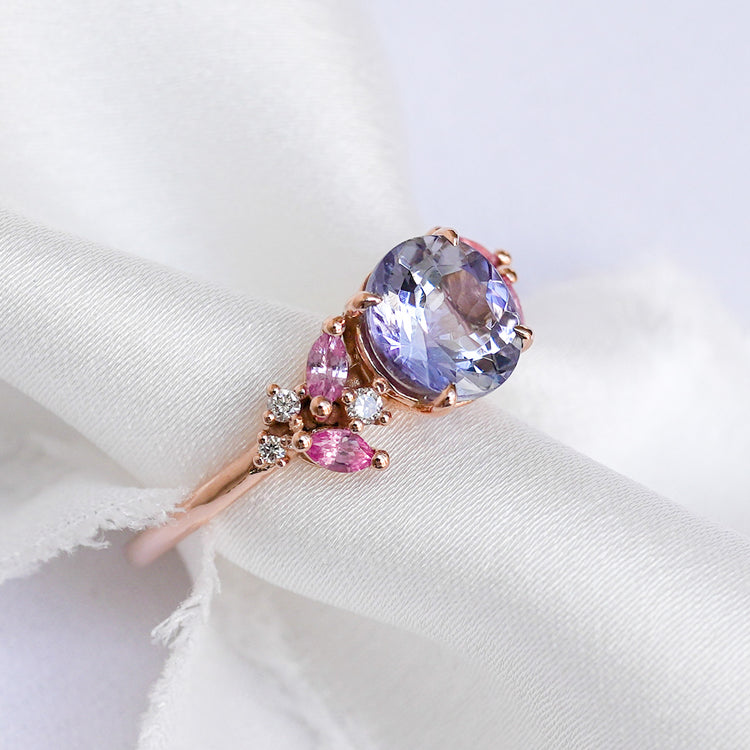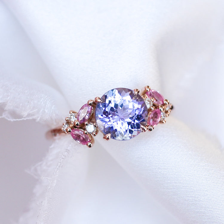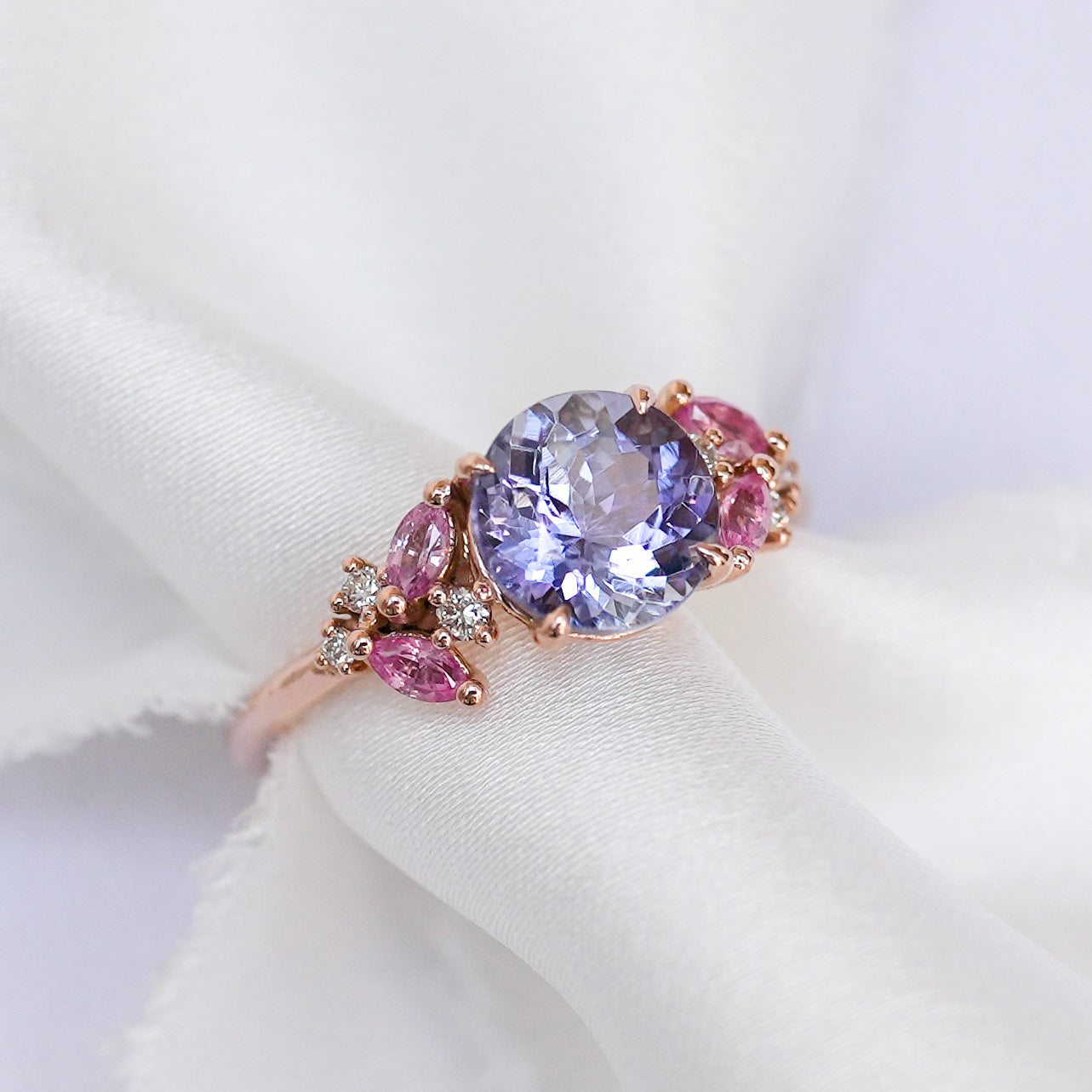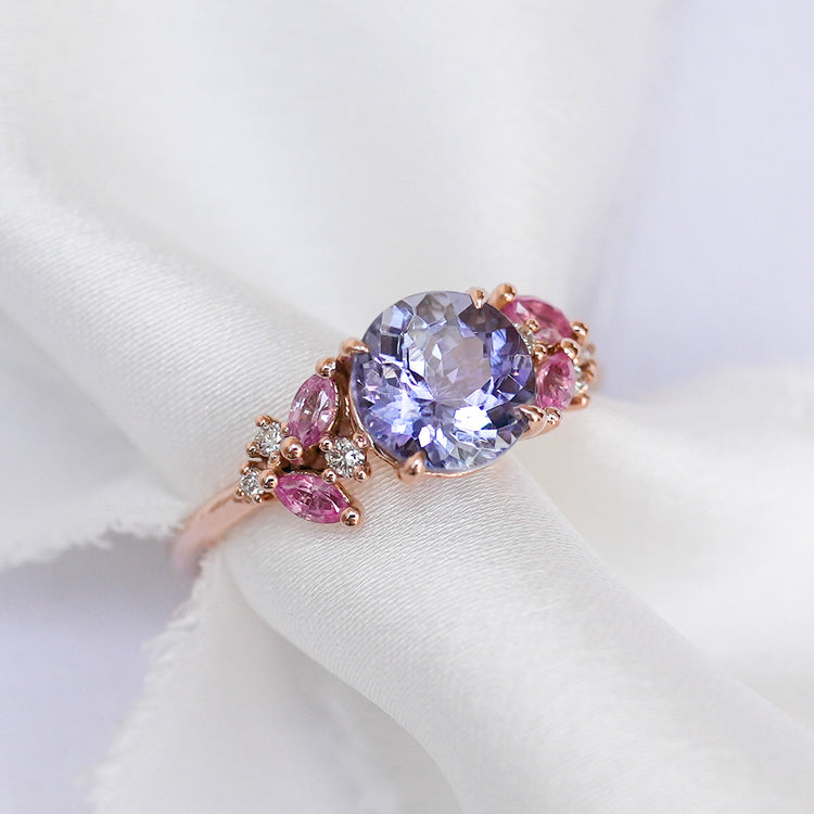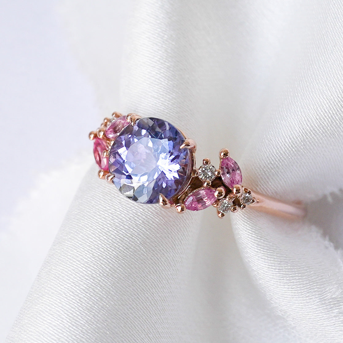 An unheated lavender Tanzanite glows at the heart of this enchanting design, its soft lilac tones exuding natural elegance. The ring band is crafted as a delicate gem-studded vine, adorned with pink Sapphires and Diamonds that intertwine gracefully. Romantic and artistic, this piece captures the beauty of nature in a timeless jewel.