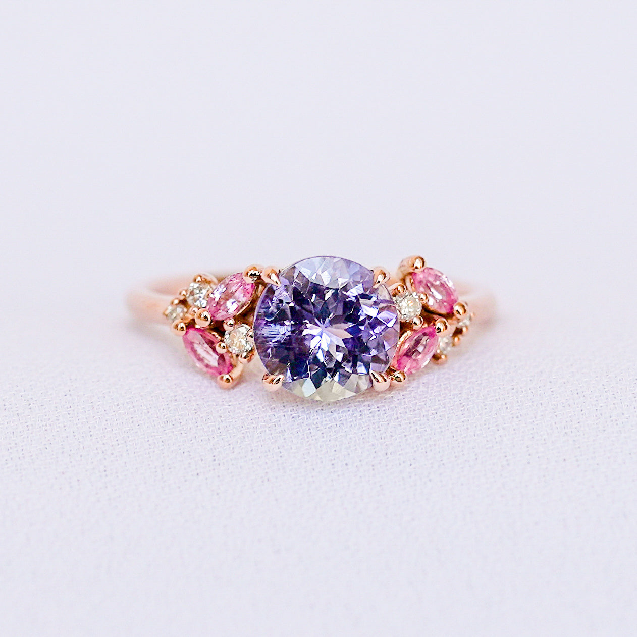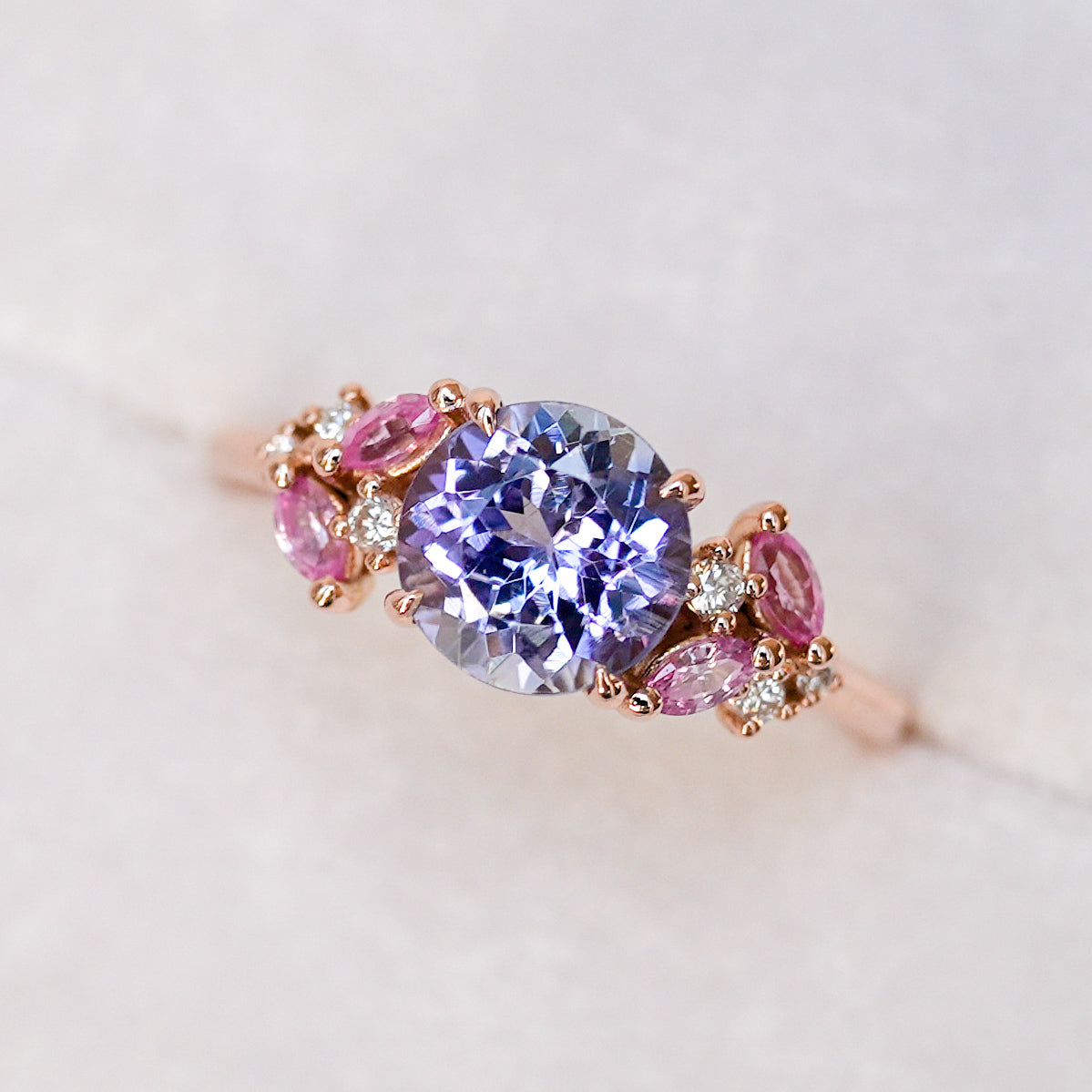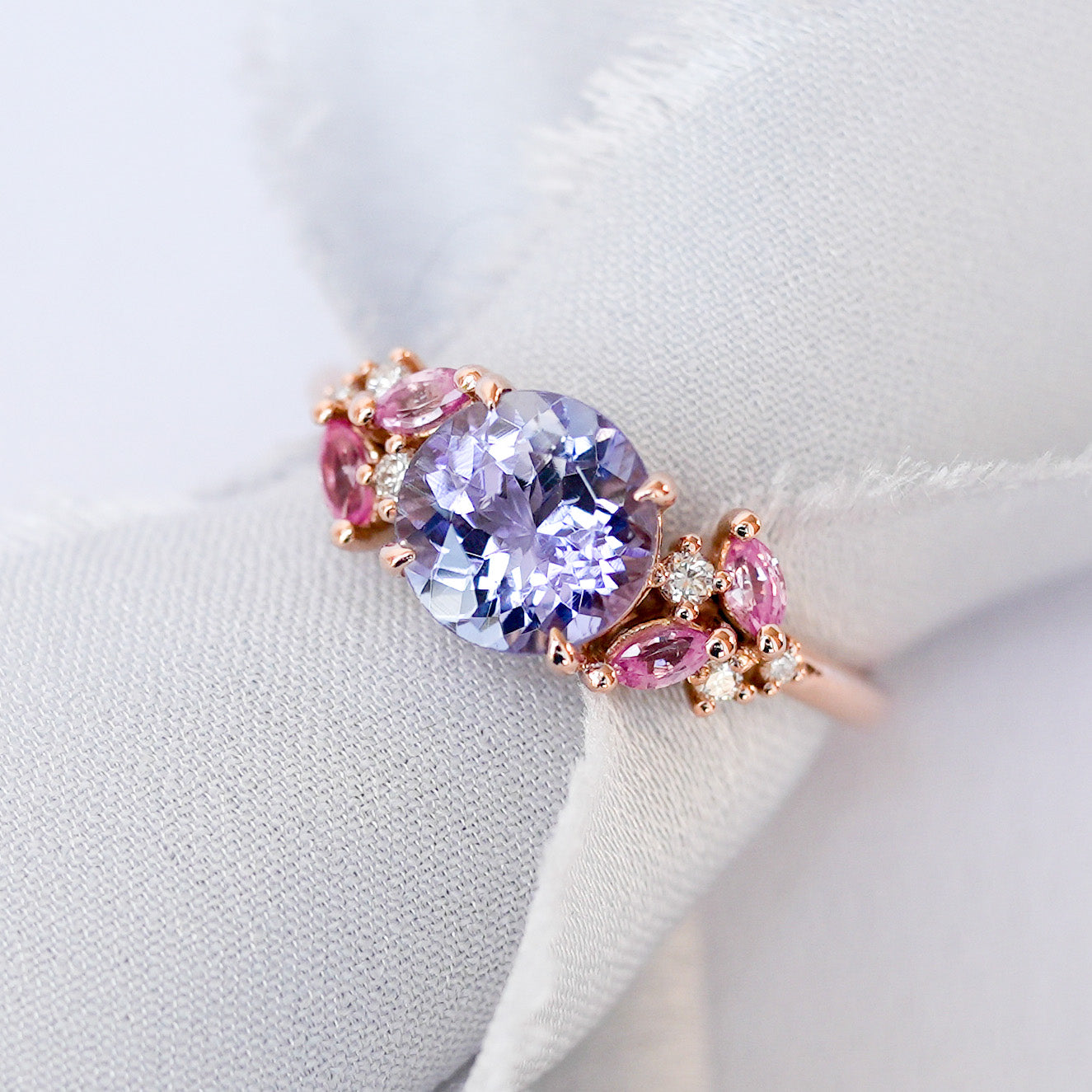An unheated lavender Tanzanite glows at the heart of this enchanting design, its soft lilac tones exuding natural elegance. The ring band is crafted as a delicate gem-studded vine, adorned with pink Sapphires and Diamonds that intertwine gracefully. Romantic and artistic, this piece captures the beauty of nature in a timeless jewel.