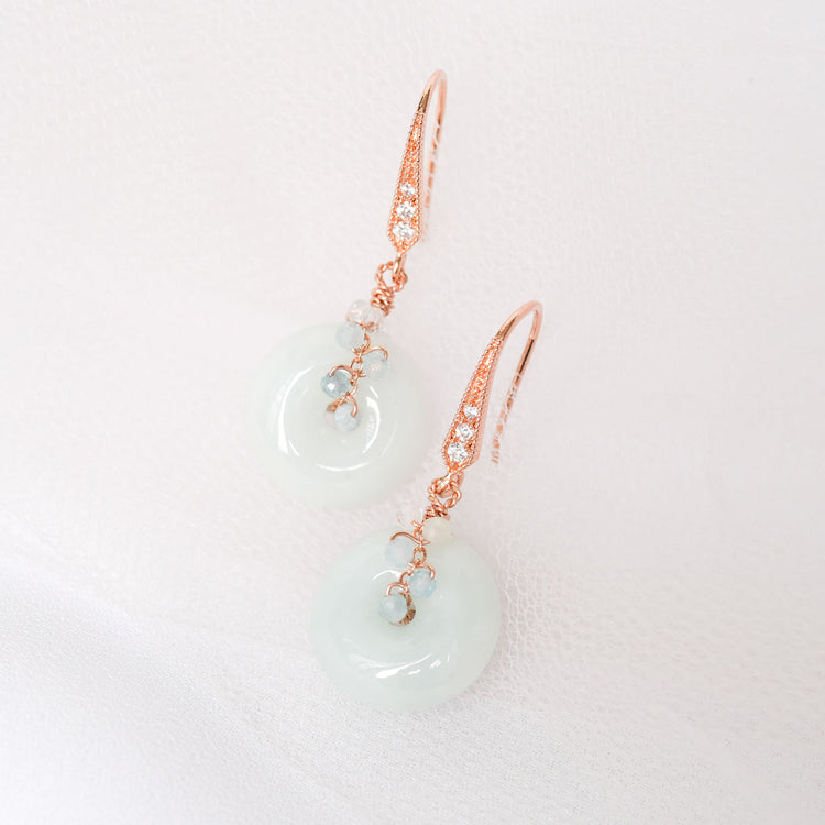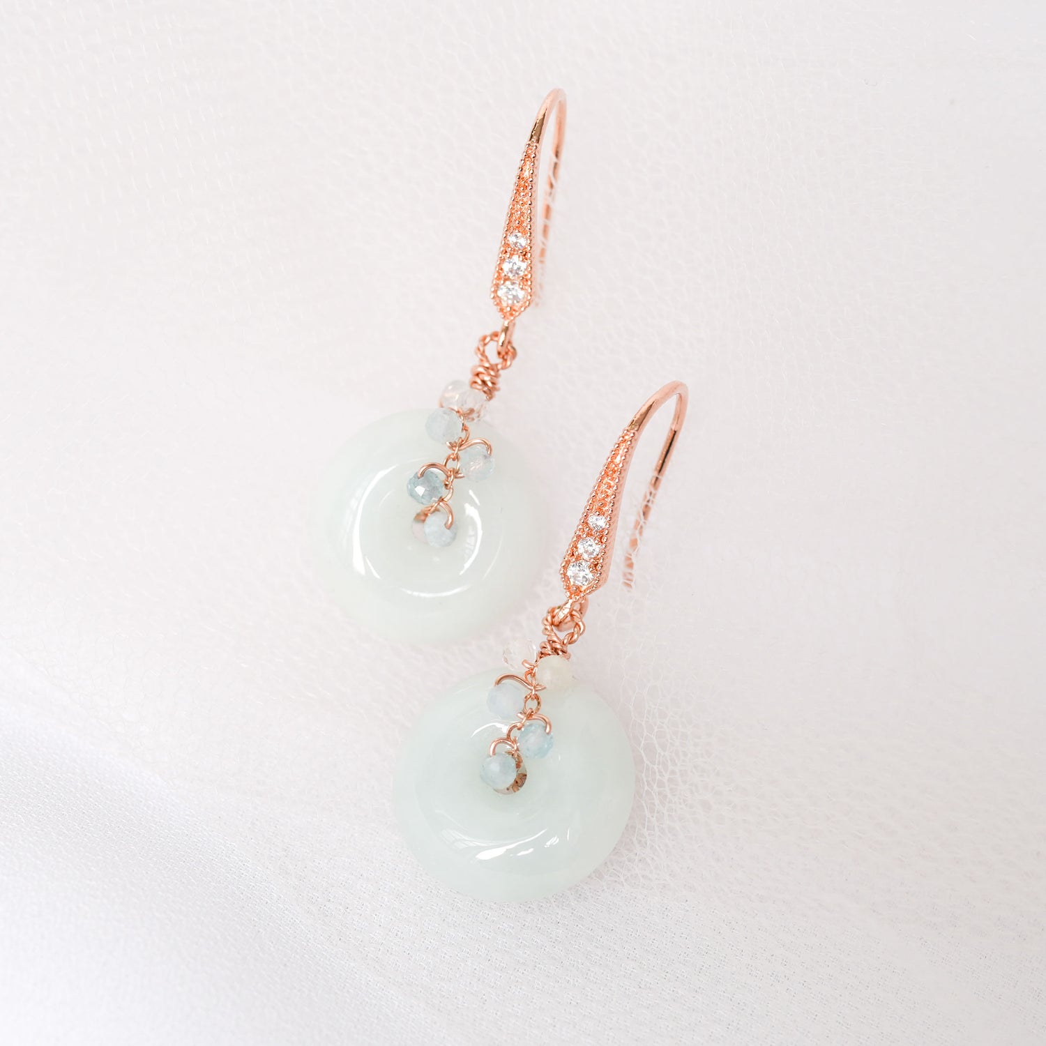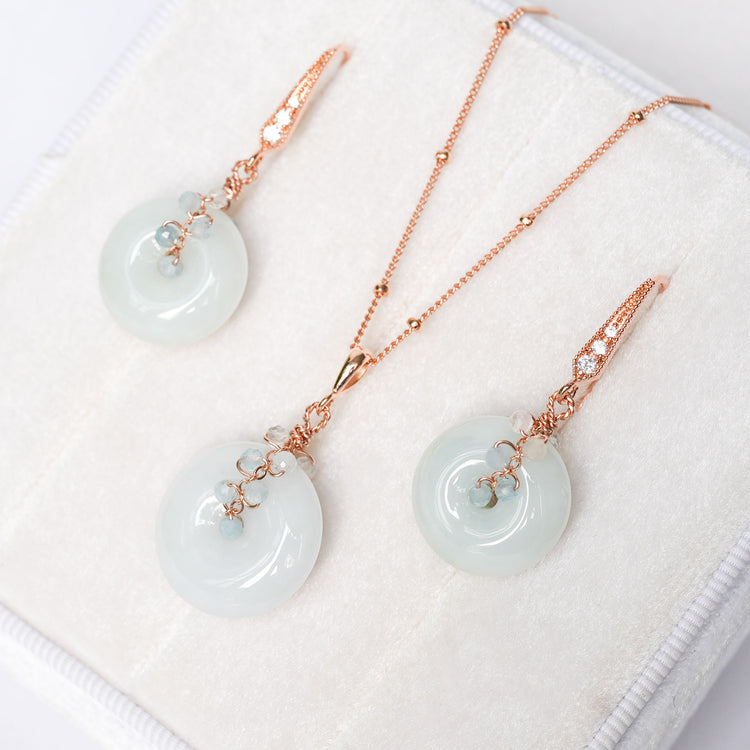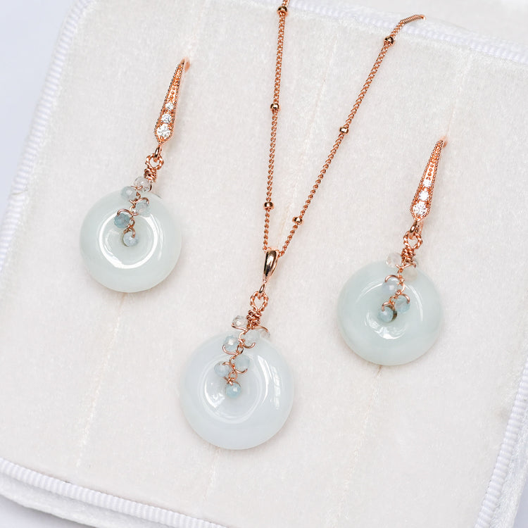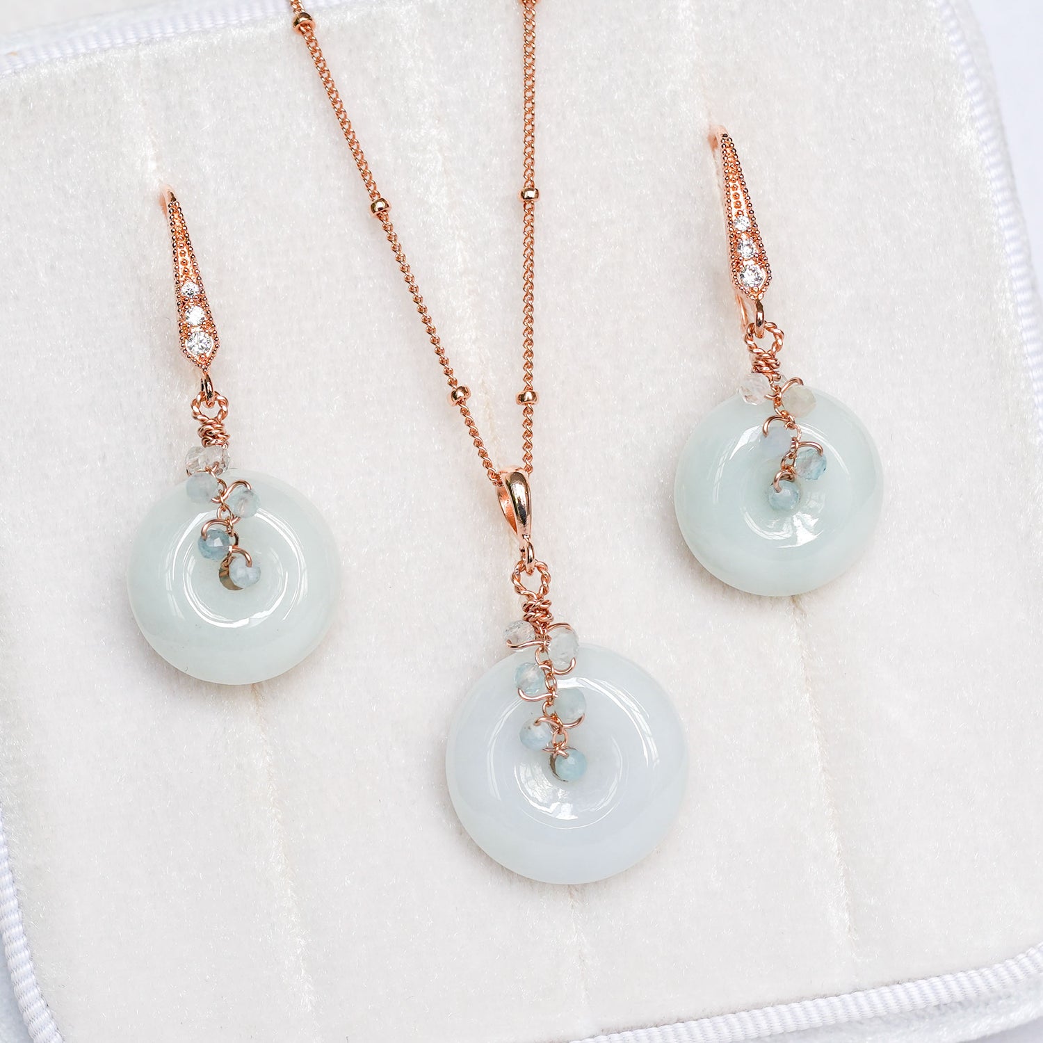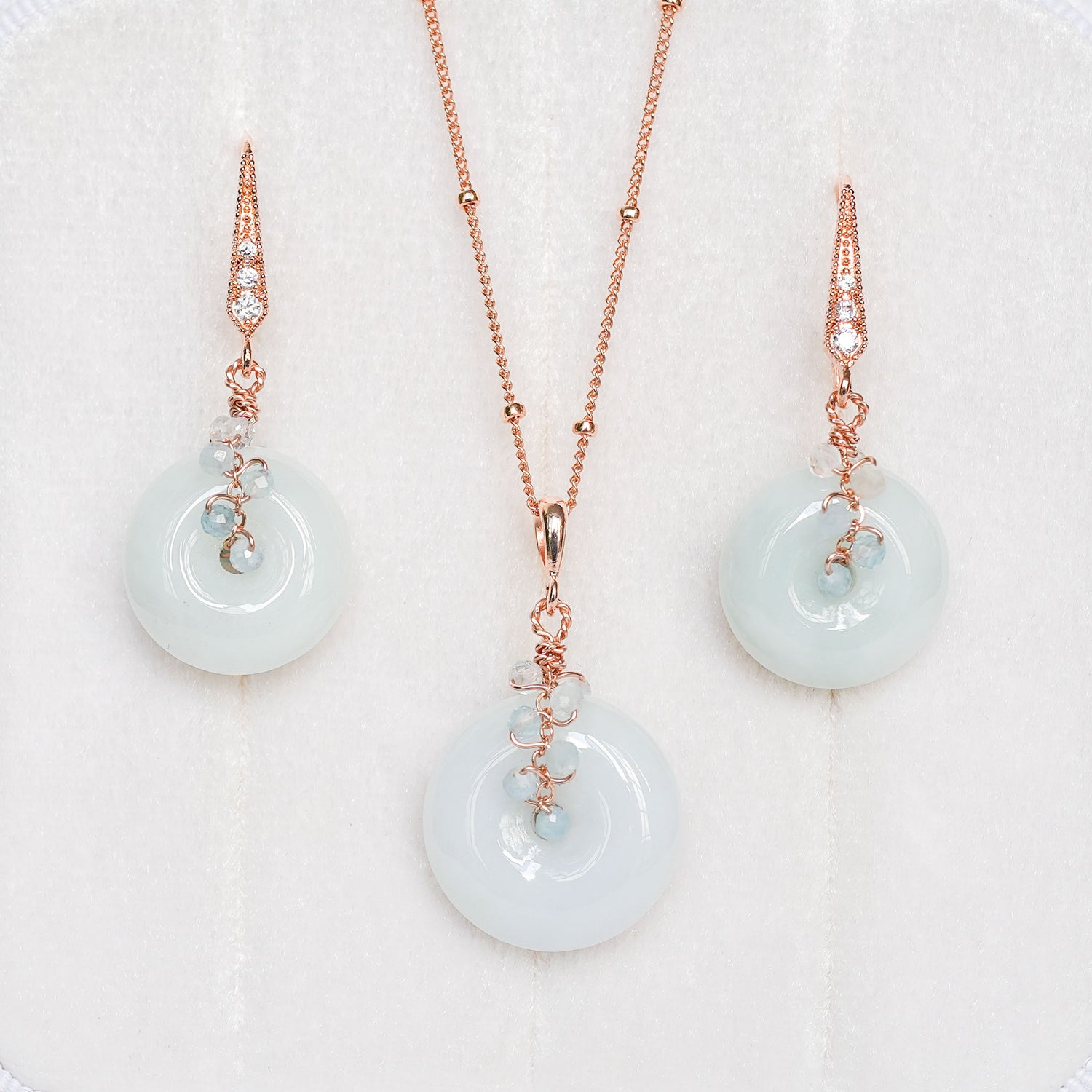 A jewellery set for the modern Jade lover. Jade donuts, carefully matched, are cocooned in an ombre Aquamarine vine, make up these earrings and necklace that you can wear together, or on their own. Pair with simple T-shirt and jeans, or go dressy with them, it's your choice. :)