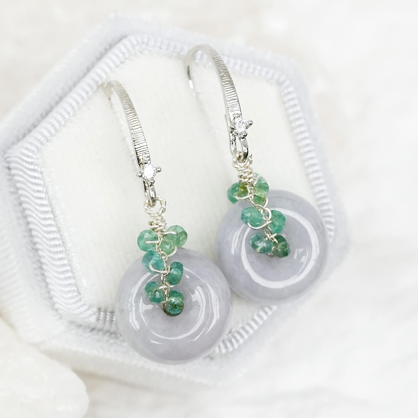 I made these Lavender Jade earrings for you, my fellow modern Jade lover. These vivid Lavender Jade donuts are cocooned in a vine of Emerald gems. They're really easy to dress up or casual, depending on your mood and the occasion.