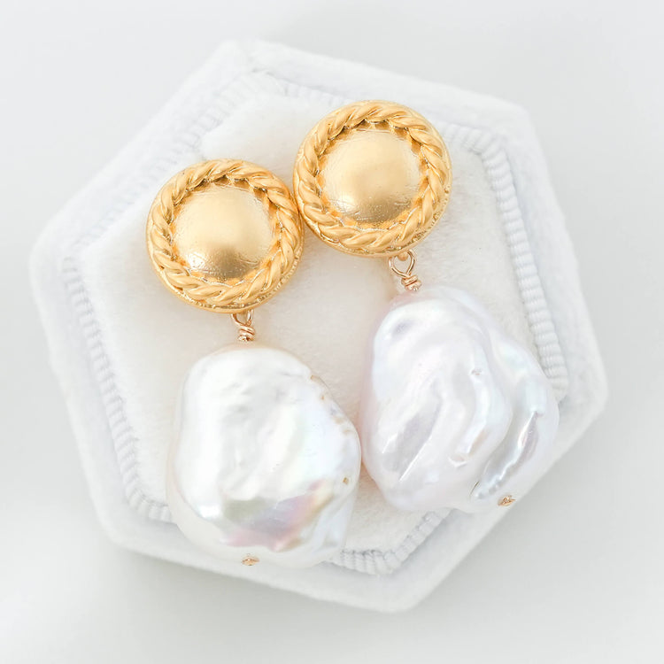 Crafted with beautiful, lustrous keshi pearls and medallion ear studs, these earrings create a sophisticated and distinctive look. Suitable for formal and casual occasions, these earrings will surely add a chic touch to any ensemble.